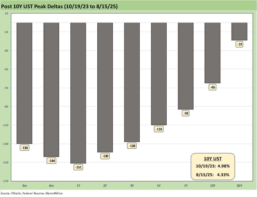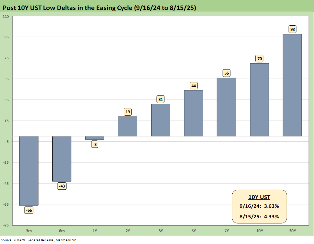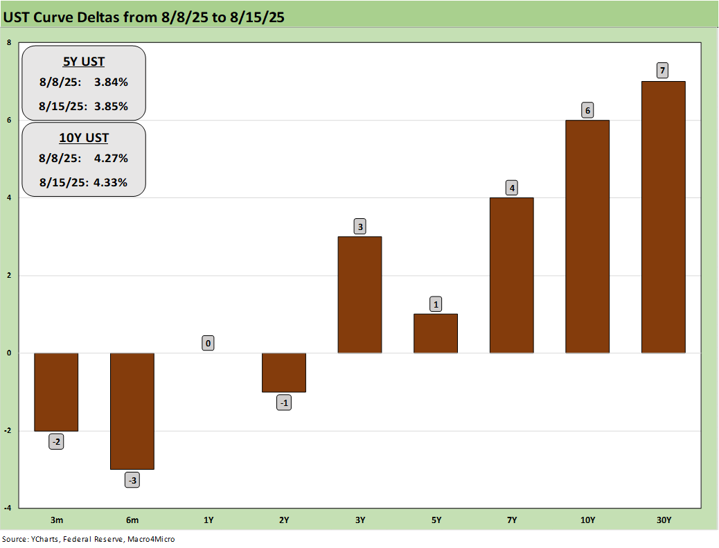The above chart updates the 1-week UST deltas with a modest upward shift from 3Y to 30Y that hit bond returns during the week (see Footnotes and Flashbacks: Asset Returns 8-16-25).