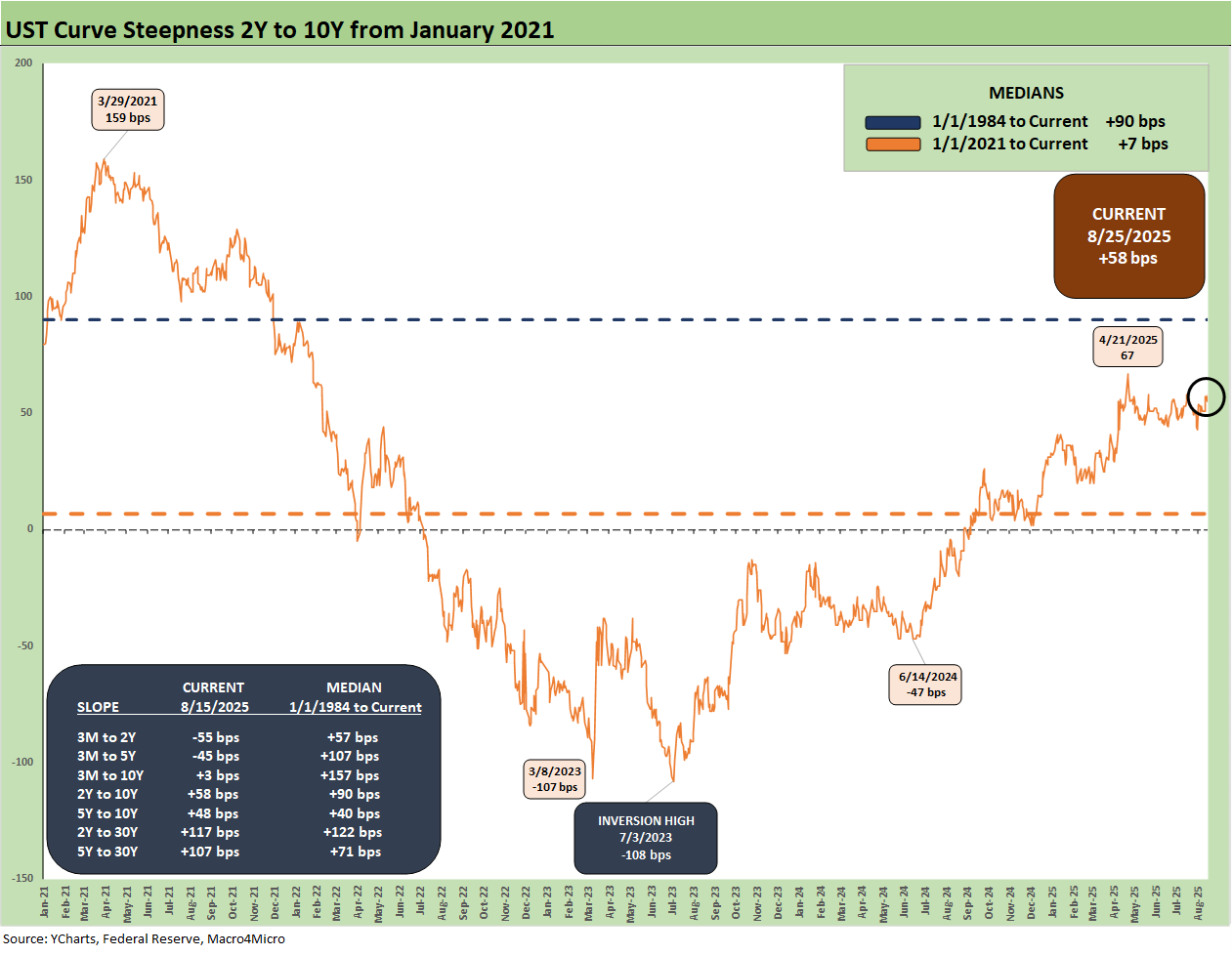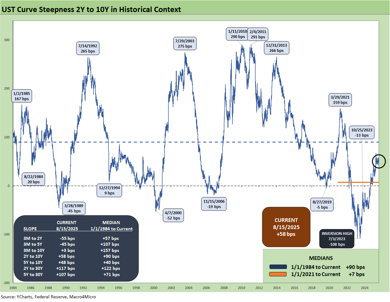 The above chart updates the 2Y to 10Y UST slope after a modest upward shift across 3Y to 30Y this week. The above box within the chart updates the UST curve segments we follow with the latest slope and long-term medians.