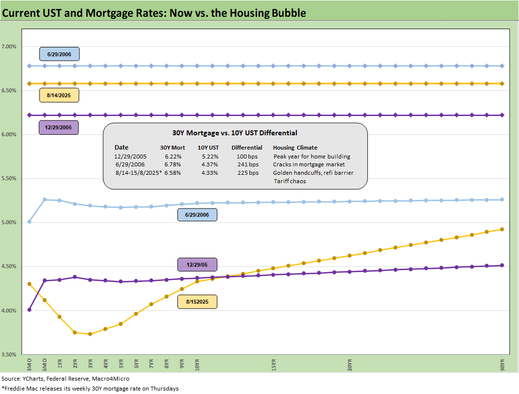 The above chart posts the UST curve for this past Friday and the Freddie Mac 30Y Mortgage benchmark rate (noon Thursday release). We include two useful historical periods including the peak homebuilder year end of 2005 and mid-2006 when RMBS quality concerns were catching headlines as the housing bubble was peaking.