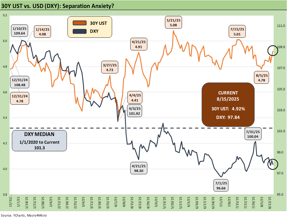 The above chart updates the 30Y UST vs. the dollar index (DXY) from the start of 2025. We saw the dollar weaken again (98.26 last week) and the 30Y move higher this week (last week 4.85%).