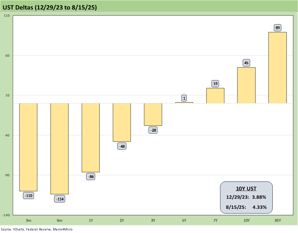The above chart updates the UST deltas from the end of 2023 after a massive rally in rates and risk in Nov-Dec 2023. The follow-on in 2024 expected by the consensus mildly disappointed the UST bulls in the number of FOMC cuts. The market got 4 x 25 (a double in Sept 2024) but not the 5 to 6 FOMC 25 bps cuts anticipated.