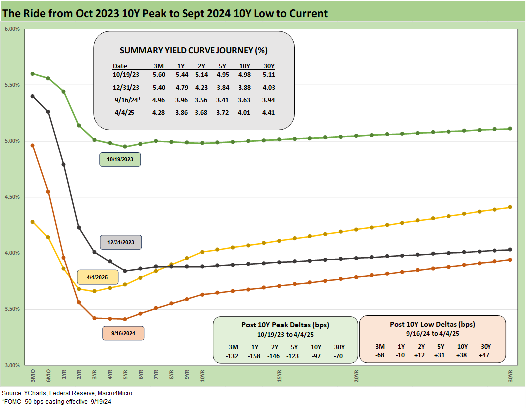 The above chart captures the sharp moves from the peak UST curve of 10-19-23 down into the major rally of Nov-Dec 2023 and then eventually into the lows of Sept 2024. The Sept 2024 lows only came after a bear steepener hit the curve through the summer of 2024. We then moved back into bear steepener mode until the tariffs hit the fan this week that sent 2Y to 30Y lower.