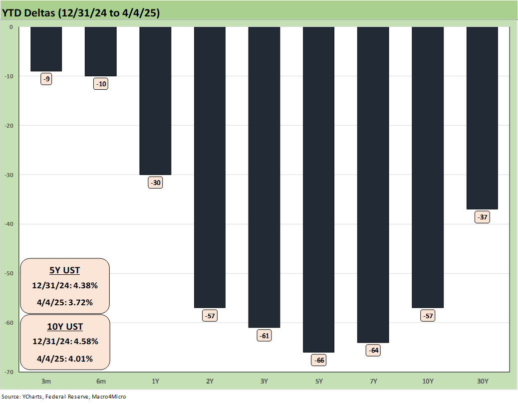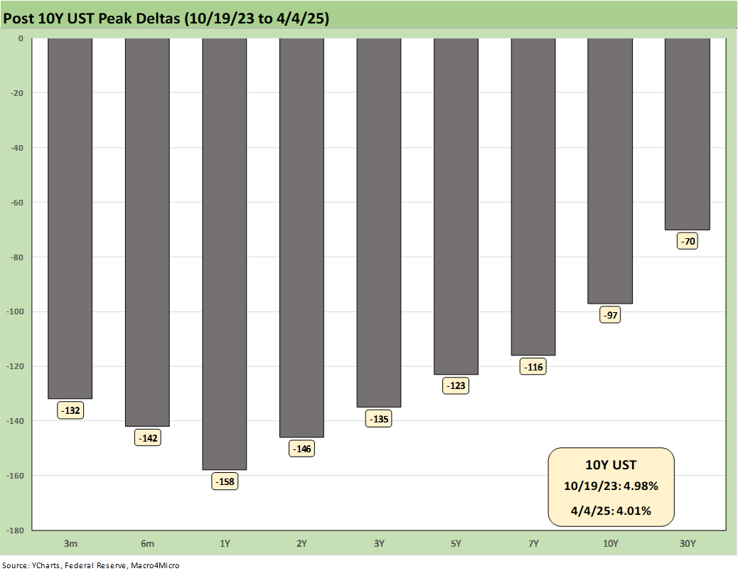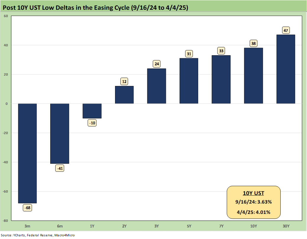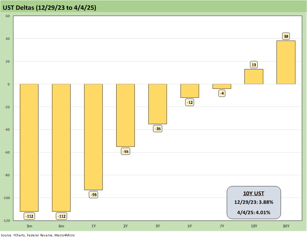 As we see in the UST delta charts further below, the UST is back to more inverted from 3M to 5Y and 3M to 10Y as the FOMC handicapping begins anew. The swing in handicapping to 5 or 6 cuts in 2025 may be just panic reactions, but the price stability and full employment mandate comes first for the Fed and not the whims and wishes of Trump. It will be 5 or 6 cuts if the tariffs have the expected impacts on economic growth and payroll and if inflation remains muted. That is the best outcome under this reckless tariff regime.