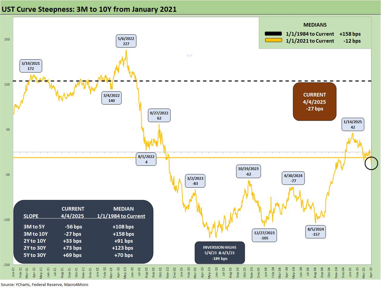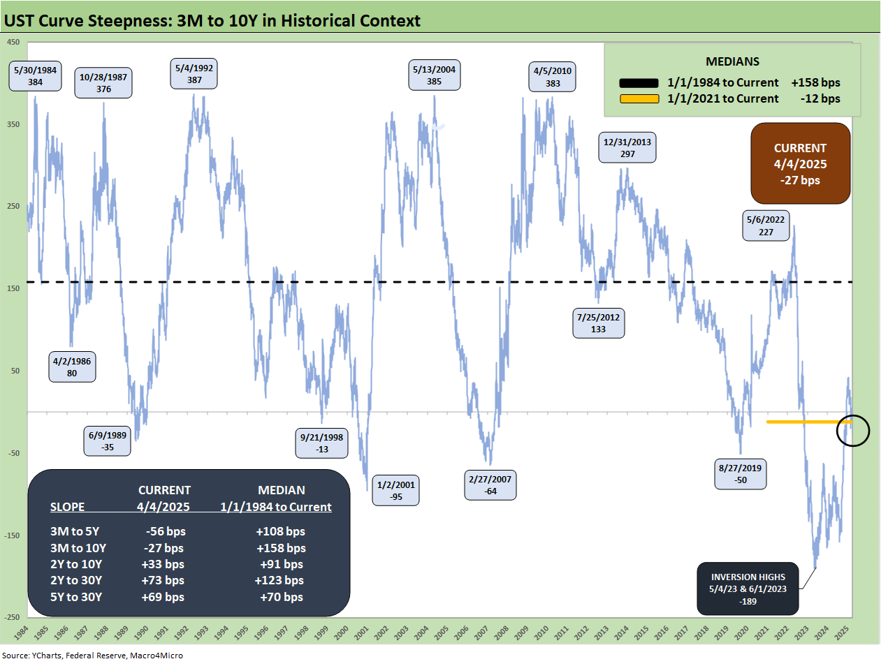 Forecasting the UST curve has not been easy with the start of 2024 calling for repeated cuts (many predictions of 5-6 cuts) and a downward shift. We got 4 of those cuts later in 2024 but the protracted flattening called for by the end of 2024 was not in place by then. YTD 2025 had seen modest bull flattening (after some initial weakness) from where 2025 started as we cover below in the UST delta charts. The bull flattening is now back to a steeper inversion from 3M to 5Y and 3M to 10Y as detailed below.