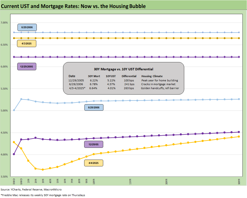 The materially lower UST curve and 10Y UST now vs. 2006 still sees current mortgage rates closer to but slightly below mid-2006. Dec 2005’s Freddie Mac 30Y rate at 6.22% is well below current mortgage rates despite a slightly higher 10Y UST in Dec 2005 vs. the past Friday close. Back in Dec 2005, the Freddie 30Y at 6.22% was only 100 bps above the 10Y UST.
