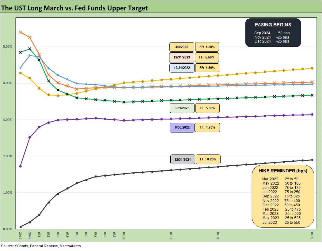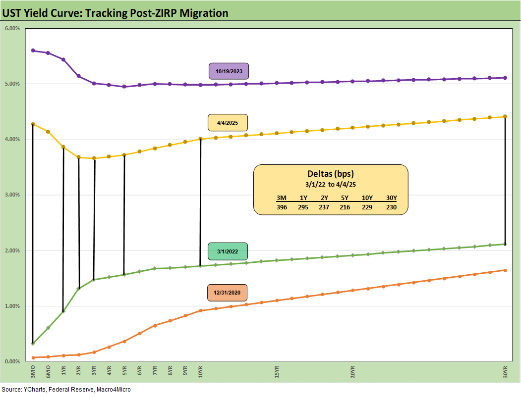We wrap this week’s State of Yields with an update of the running UST deltas since March 1, 2022 just ahead of the end of ZIRP (effective 3-17-22). We include the 12-31-20 UST curve and 10-19-23 peak UST curve as frames of reference.