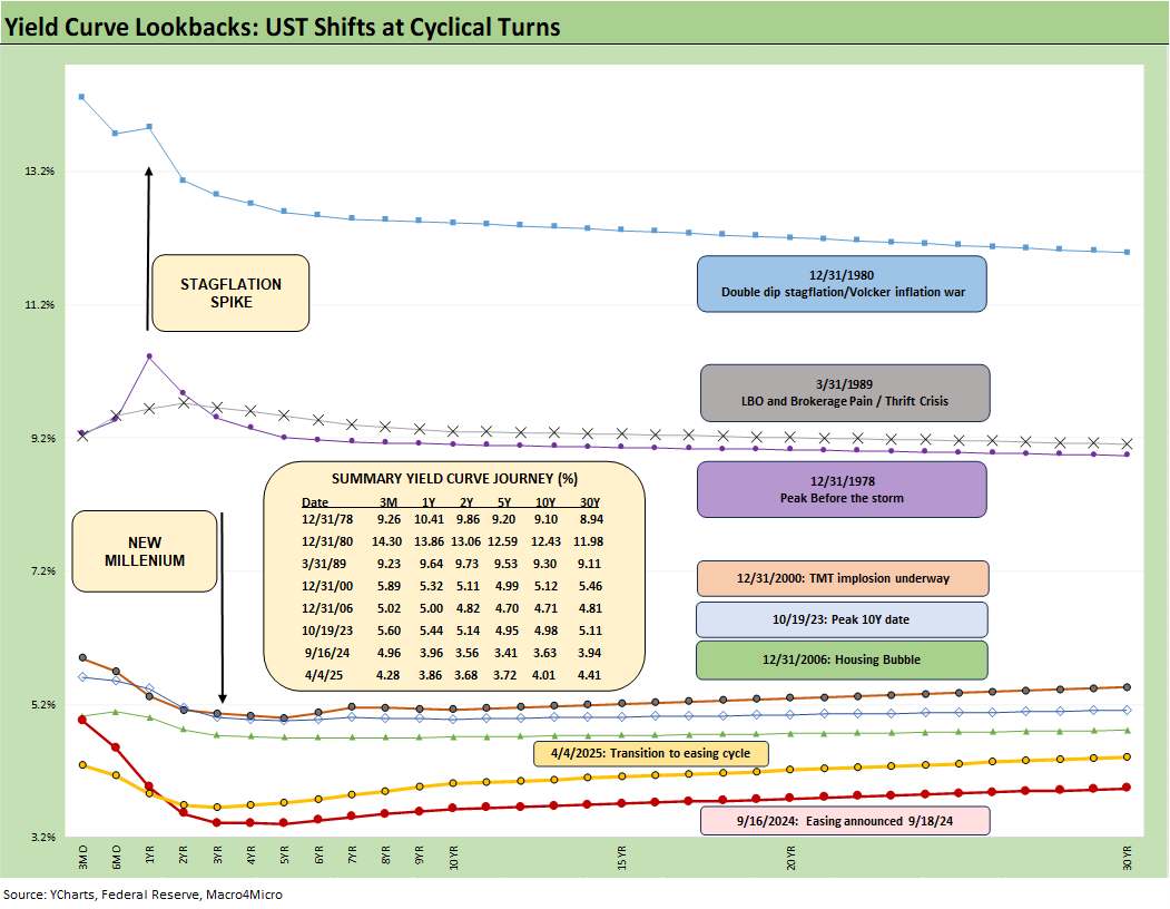 The UST curve is back to more inverted from 3M to 10Y and the UST moves now face the added uncertainty of balancing recession handicapping with inevitable tariff-driven price increases. This is the first real stagflation vs. growth juggling act for the markets since Volcker (UST Moves 1978-1982: The Inflation and Stagflation Years 10-18-23).