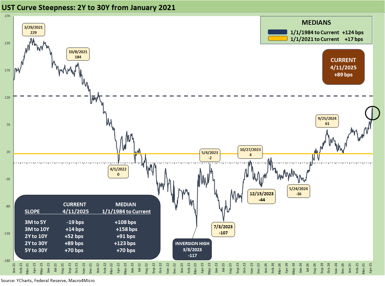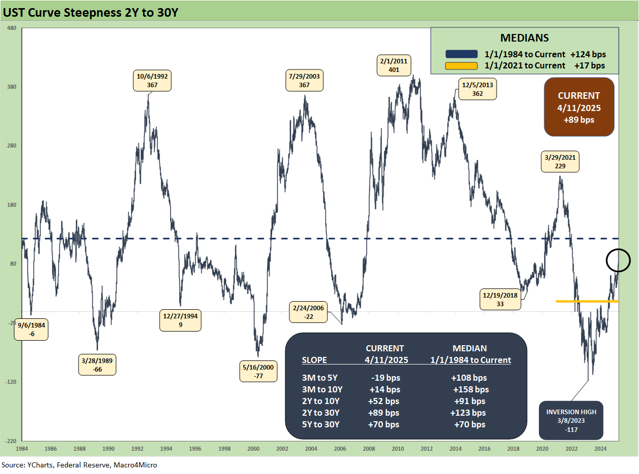 This week we update the 2Y to 30Y slope with the main theme being steepening and duration pain. We plot the long-term slope history above and we frame the +89 bps slope to end this week vs. the long-term median of +123 bps. The slope steepened from +73 bps last week.