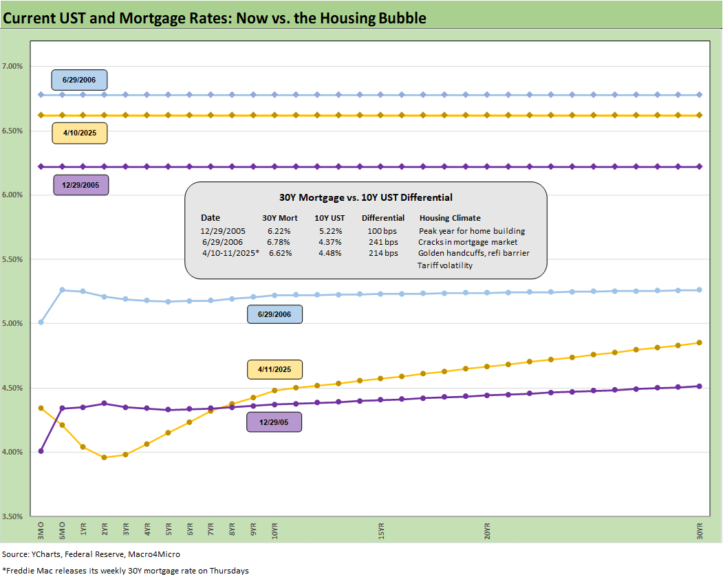 We had been seeing mortgage rates very slowly coming down again to the mid-6% area with this past week at 6.62% (-2 bps from the prior week). That is now shot by the steepening of the UST curve on tariff inflation fears and dislocations that can still haunt the UST curve. Mortgage spreads remain a headwind vs. earlier periods. The 7% rates seen on Friday are just another hit to monthly payments and affordability.