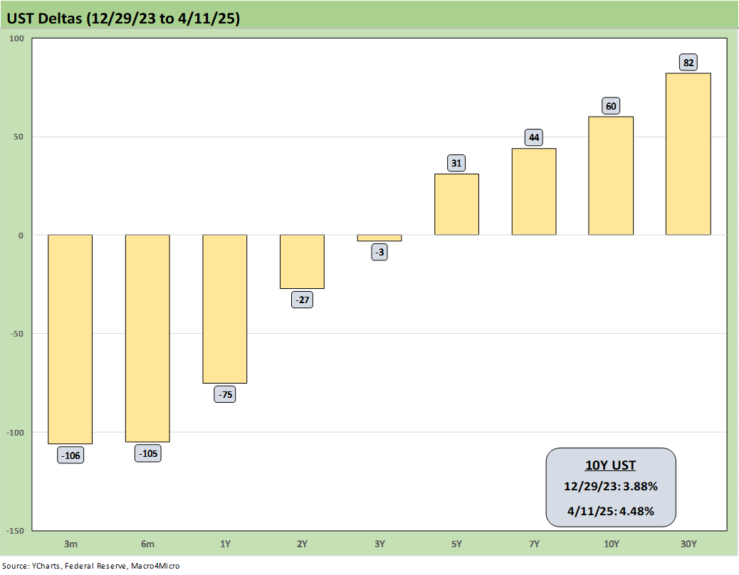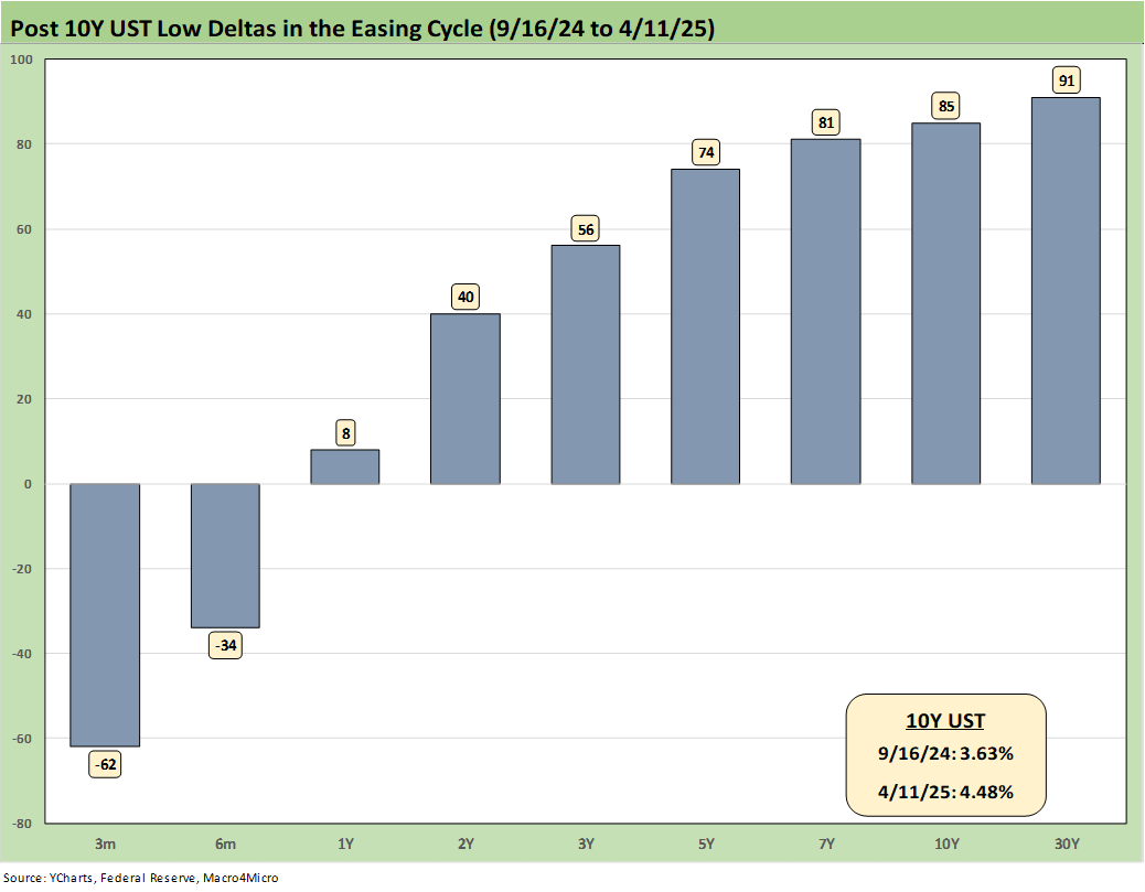 The above chart updates the UST deltas from the 9-16-24 lows. The bear steepener has not been kind to duration since then.
