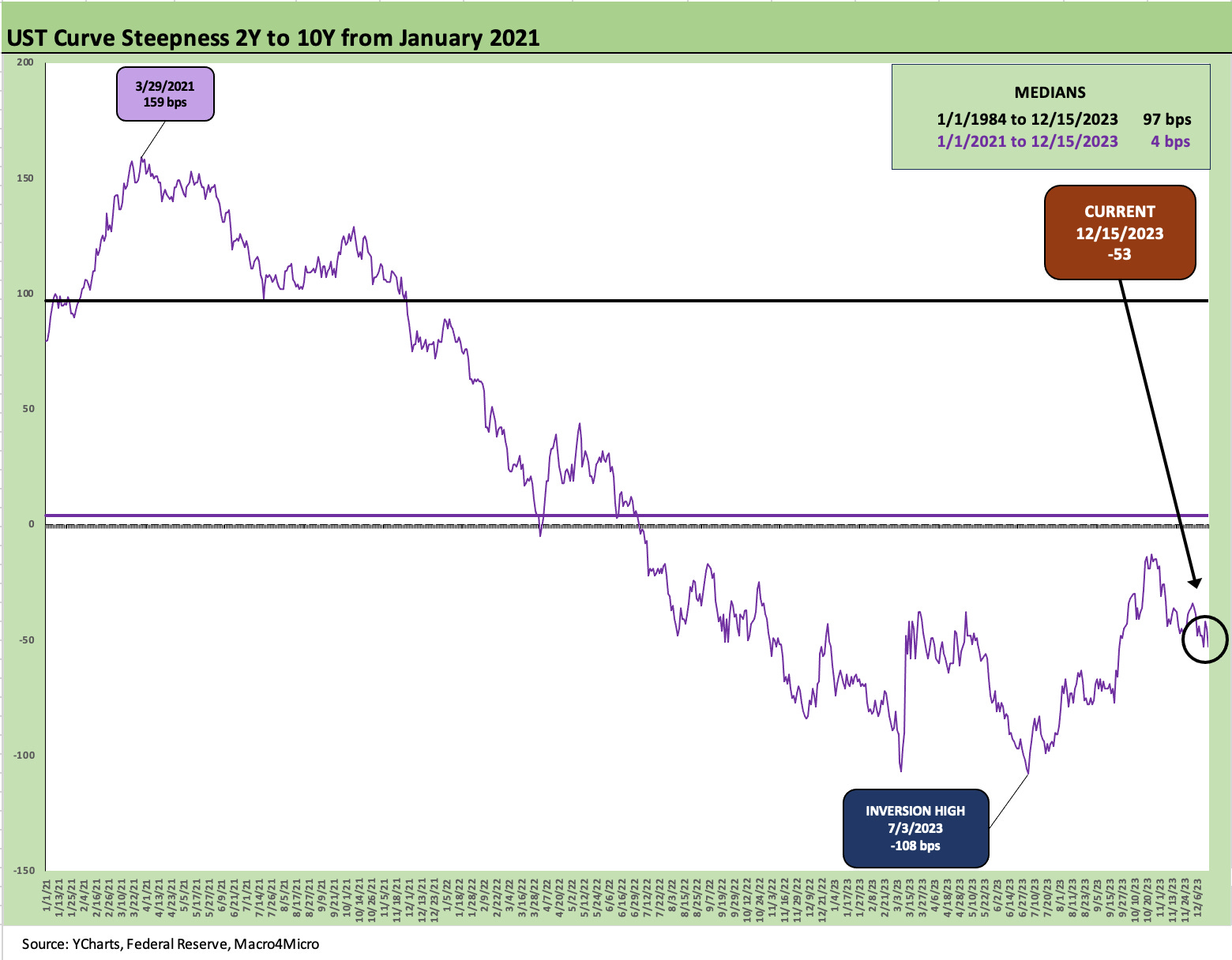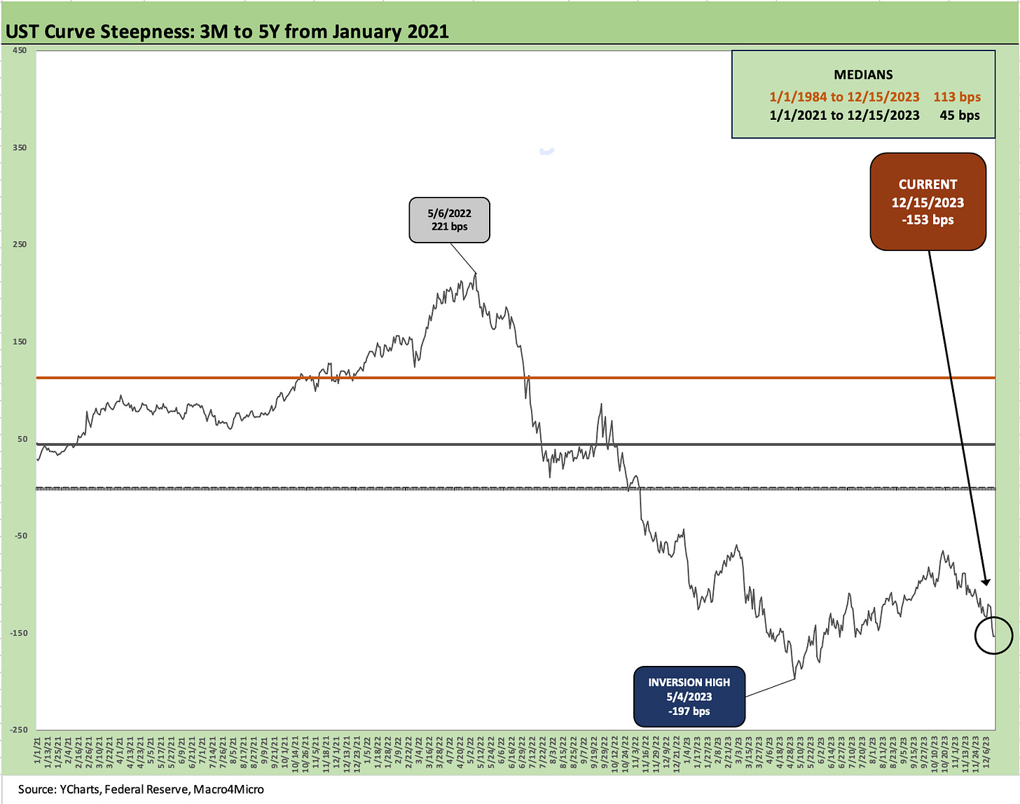 Each week we select some UST curve segments to update slopes. The above updates the 3M to 5Y UST as the increased inversion is underway again. We wrapped the week at -153 bps as it inverted more on the 5Y UST decline. We remain well above the -197 bps of May 2023.