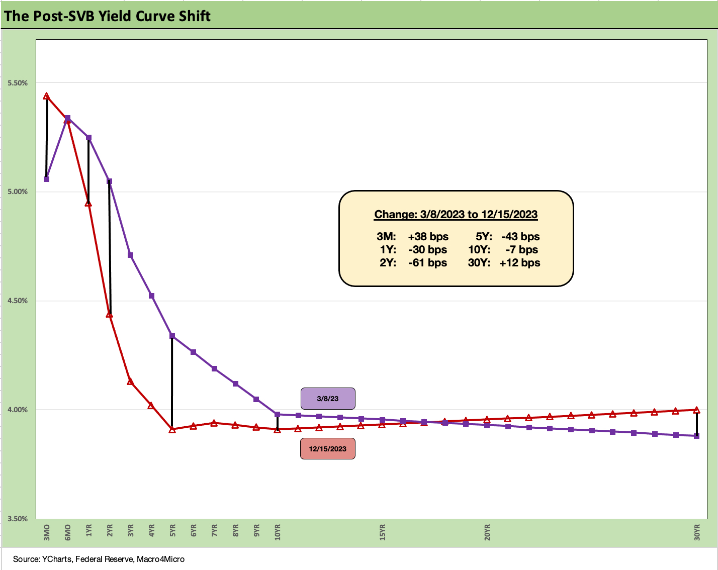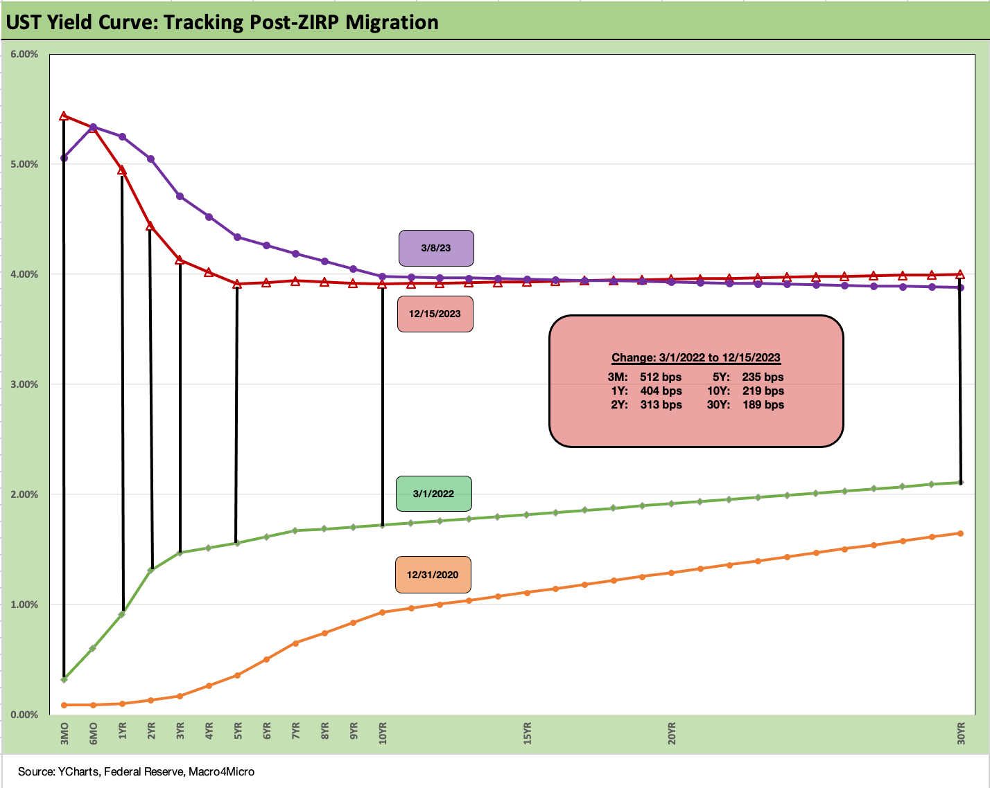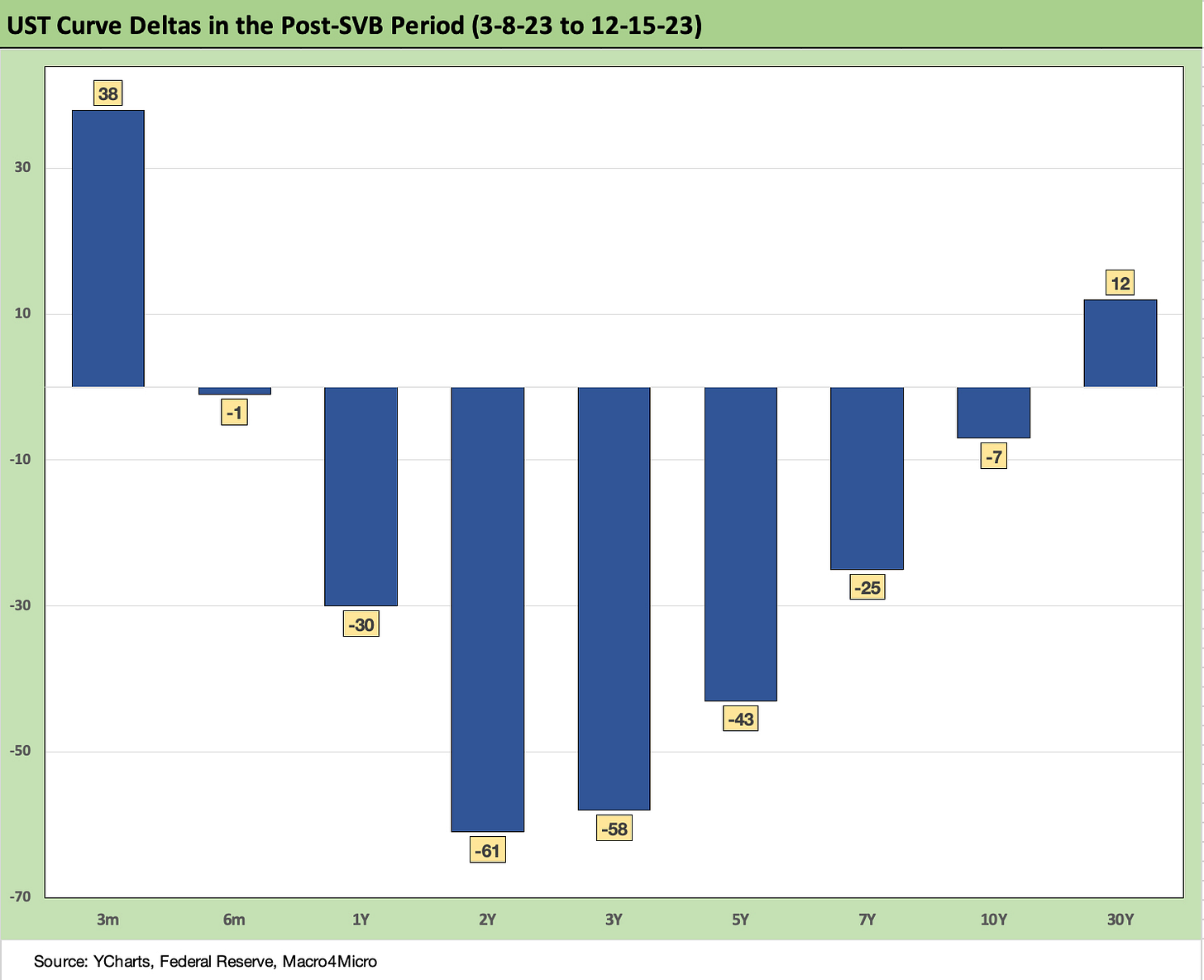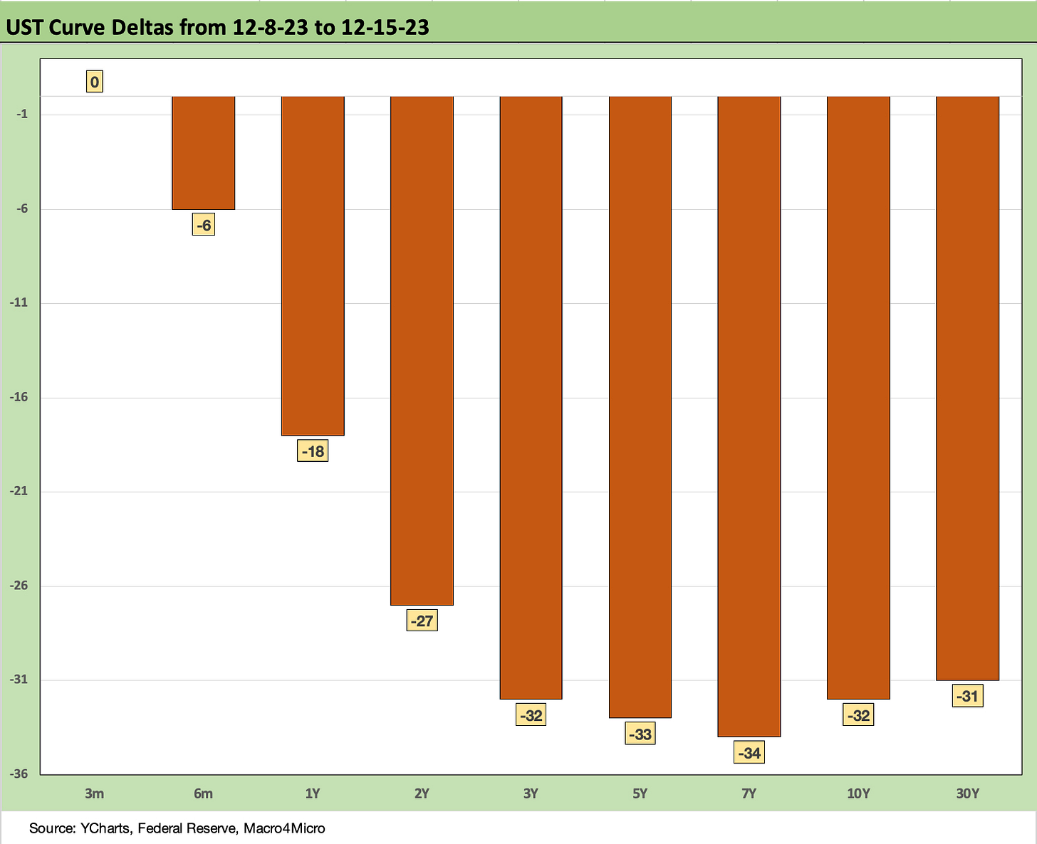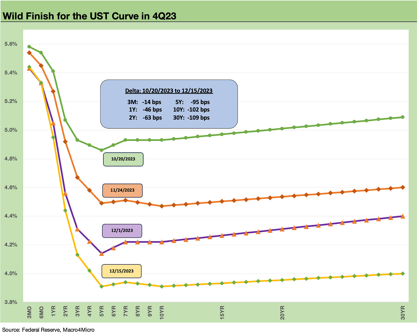 The market has traveled a long distance in a short period from that week’s asset return and UST profiles. We then show the downshift in UST across Nov into Dec with the 12-15-23 UST curve at the lows and the 5Y and 10Y UST back under the 4% line and 30Y hanging around just over the line.