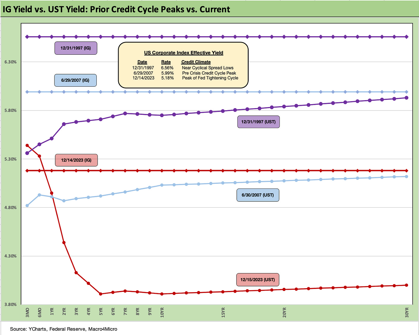 The above chart goes through a similar “then vs. now” exercise for the current UST curve and IG index yield. We compare current days to earlier credit peak periods (1997, 2007) when the IG corporate bond market was at or near credit spread lows.