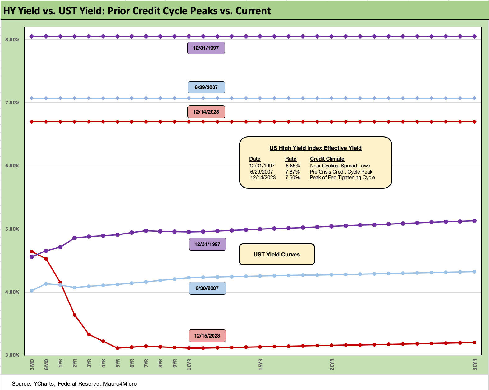 The peace and quiet of 2007 was very short-lived relative to 1997. HY OAS averaged around +270 bps in 1H07 vs. HY averaging +270 in 2H97, so the two periods have some common features in spreads. During the crazy period of June 2007 as the market fuse was burning down, we saw HY OAS of +298 bps on 6-30-07 (as tight as +244 on 6-1-07) vs. the +351 bps to end last week (12-15-23).