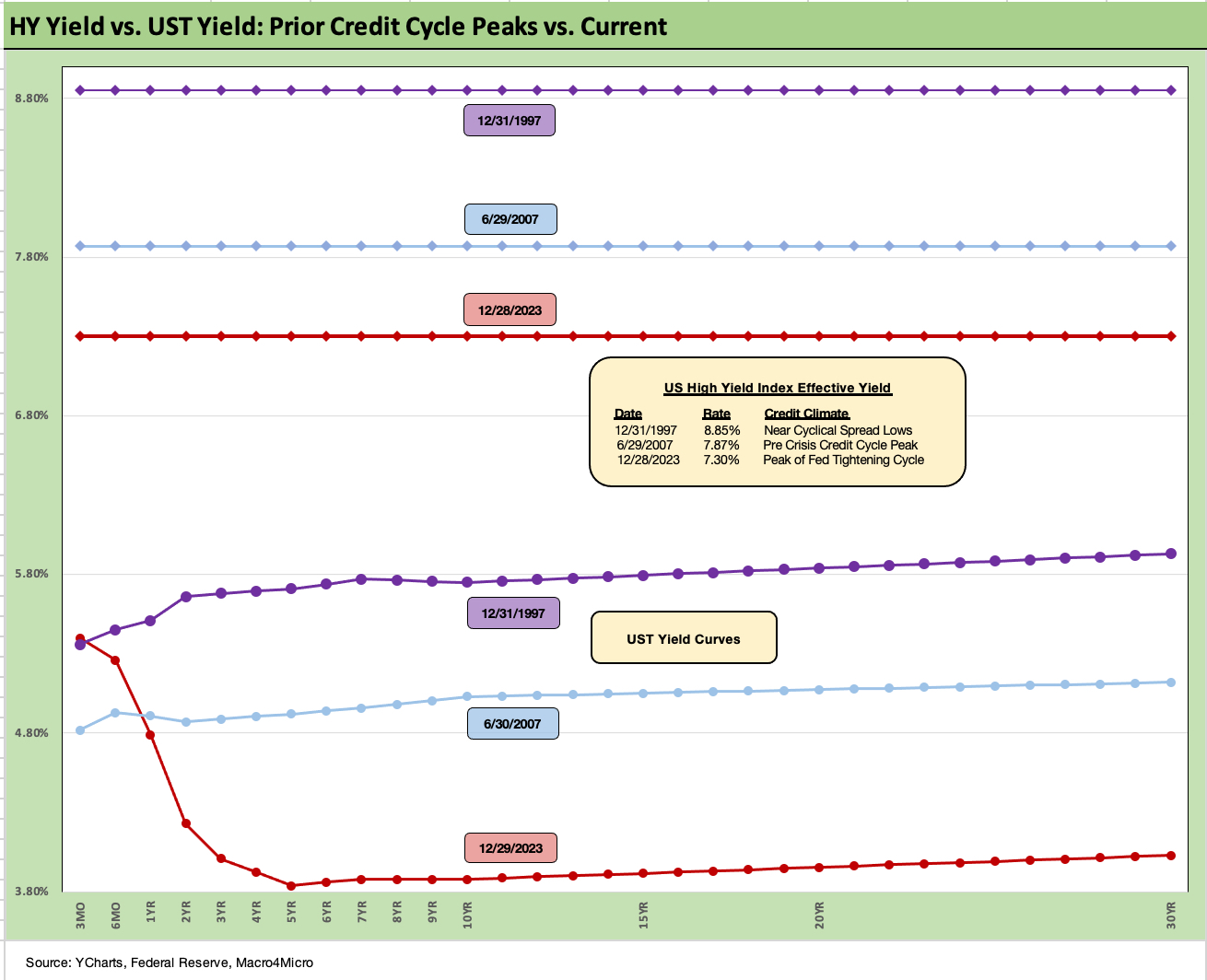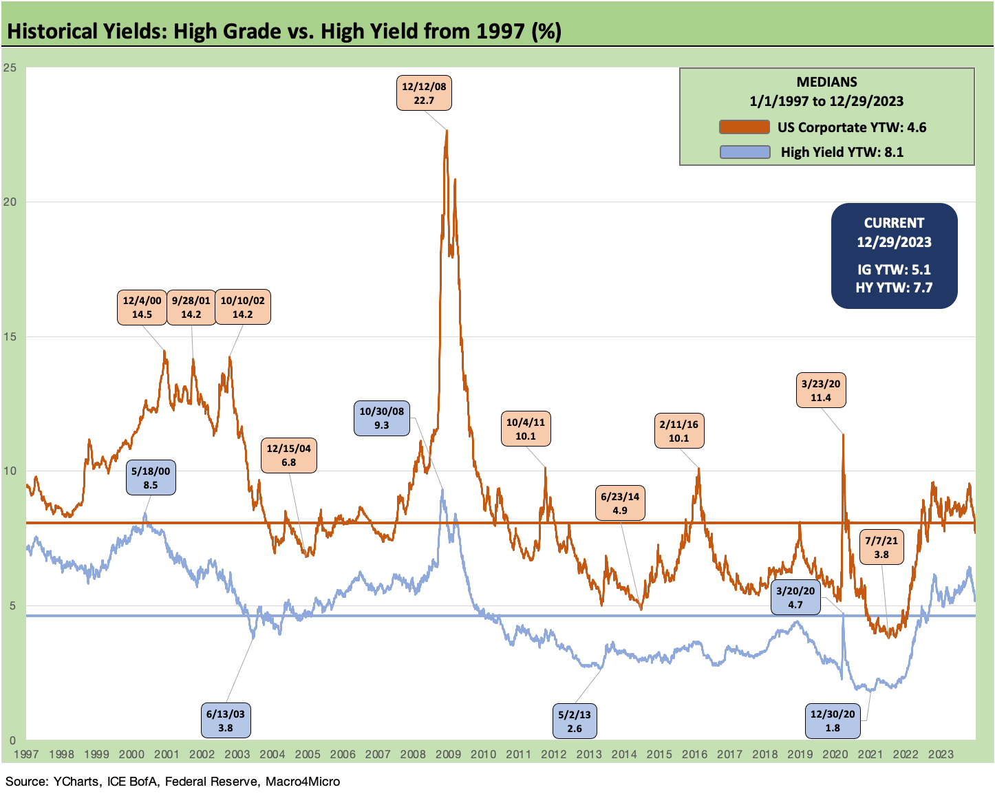 With HY moving through one of the post-crisis cyclical low points in the pre-COVID period (lows from June 2014 and Oct 2018), the history lessons are becoming more interesting again. At +334 bps to end the week and the year 2023, last week we just broke through the June 2014 levels (+335 bps on 6-23-14 vs. +332 bps on 12-28-23). That is before any index rebalancing effects that will roll in for the new year. The market could cross the early Oct 2018 level (+316 bps on 10-3-18) with one good month. If that happens, there will be a discussion of going after the exceptionally compressed 2007 and 1997 levels.