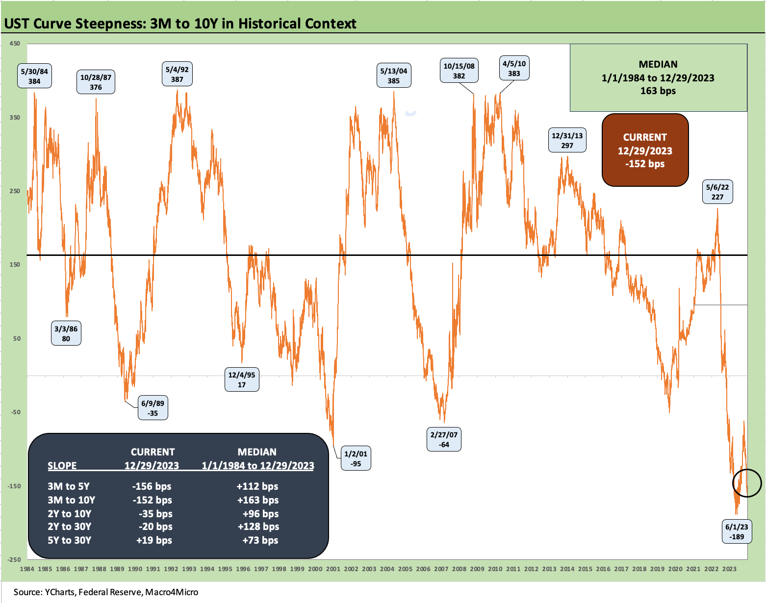 The box embedded in the chart frames various other slope segments. We detail where the UST segment slopes stand now as well as the related long-term median from the start of 1984 after the most onerous period of Volcker monetary policy.