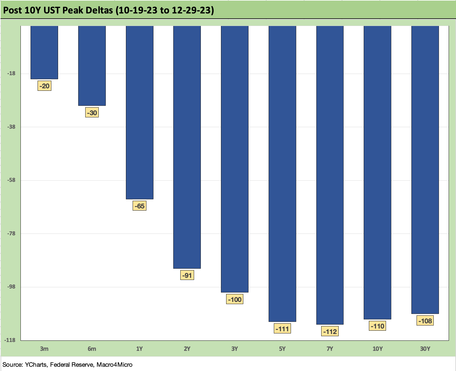 The above chart frames the UST deltas off the late Oct 2023 highs and really drives home the material bull flattener that unfolded. Inversion vs. the short end has started to revert in the direction of earlier peak negative slopes across a range of curve segments. The 3M UST is holding north of 5% since that is set by the Fed. The market is drawing its own conclusions since it controls the long end.