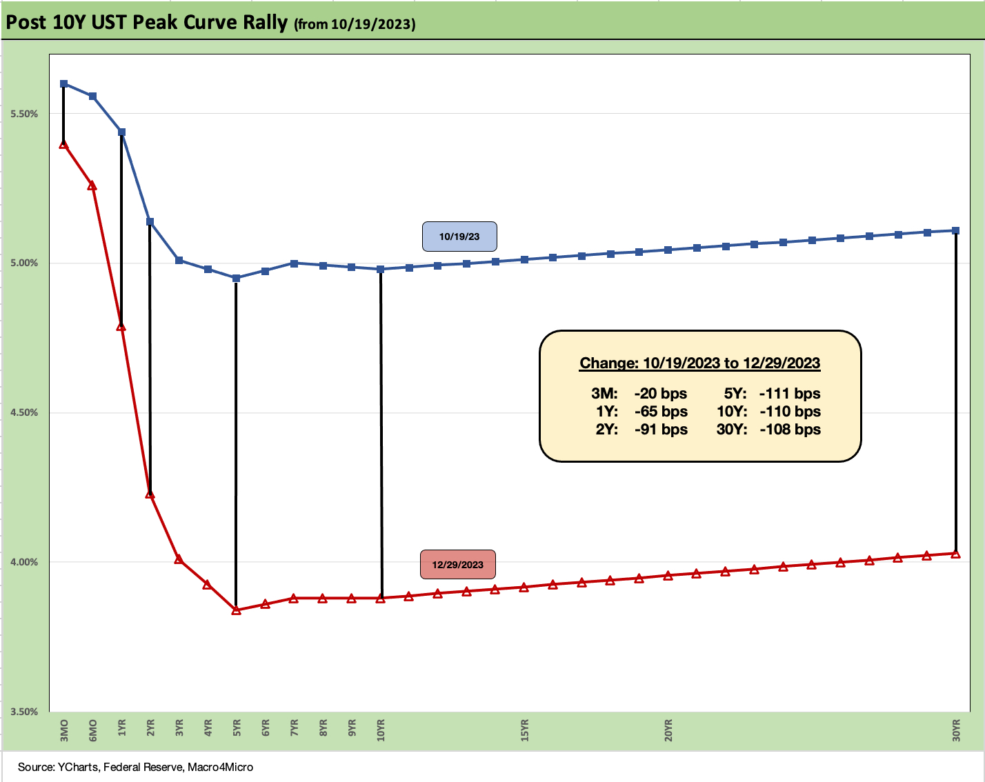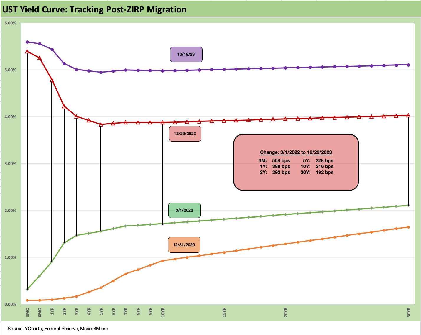 We wrap with our usual final chart that plots the migration pattern of the UST curve from the start of March 2022 just ahead of the end of ZIRP at mid-March. We plot a late Oct 2023 UST curve as the 10Y UST was flirting with a 5.0% 10Y UST over several days. We also drop in a 12-31-20 UST curve as a frame of reference. That was a very fast move.