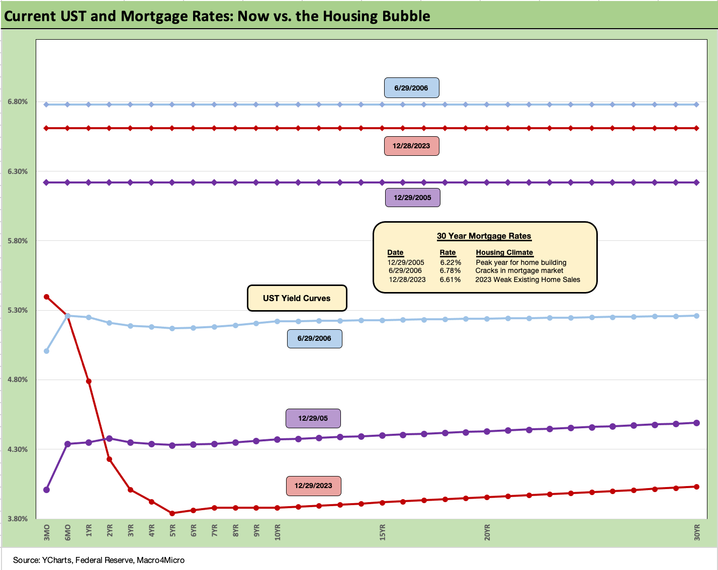 It is notable that the current UST curve is now substantially below the end of 2005 in 10Y UST and even further below the intermediate and long end of the UST curve seen in mid-2006. Despite that UST configuration, the 30Y mortgage levels of 2023 are still above 2005 but only recently dropped through 2006 in the Freddie Mac benchmark. The 30Y mortgage rates were pulling away before this latest UST curve rally in Nov and Dec 2023. The mortgage vs. UST relationship is a reminder of how mortgage spreads have trended in this cycle (much wider) vs. the years of overconfidence in the pre-crisis period.