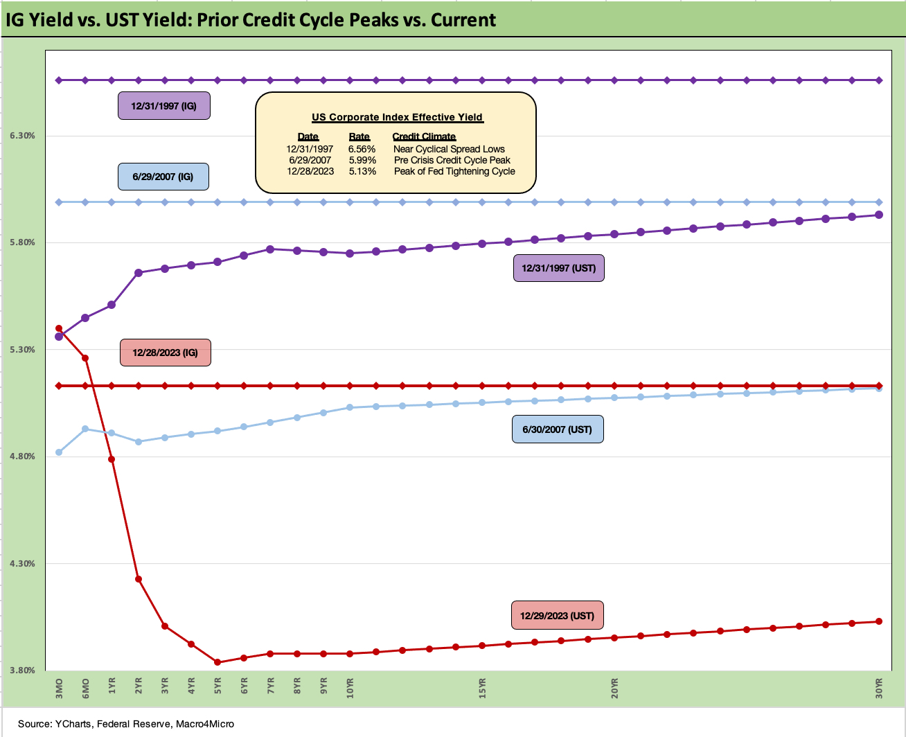 The above chart goes through a similar “then vs. now” exercise for the current UST curve and IG index yield. We compare current days to earlier credit peak periods (1997, 2007) when the IG corporate bond market was at or near credit spread lows.