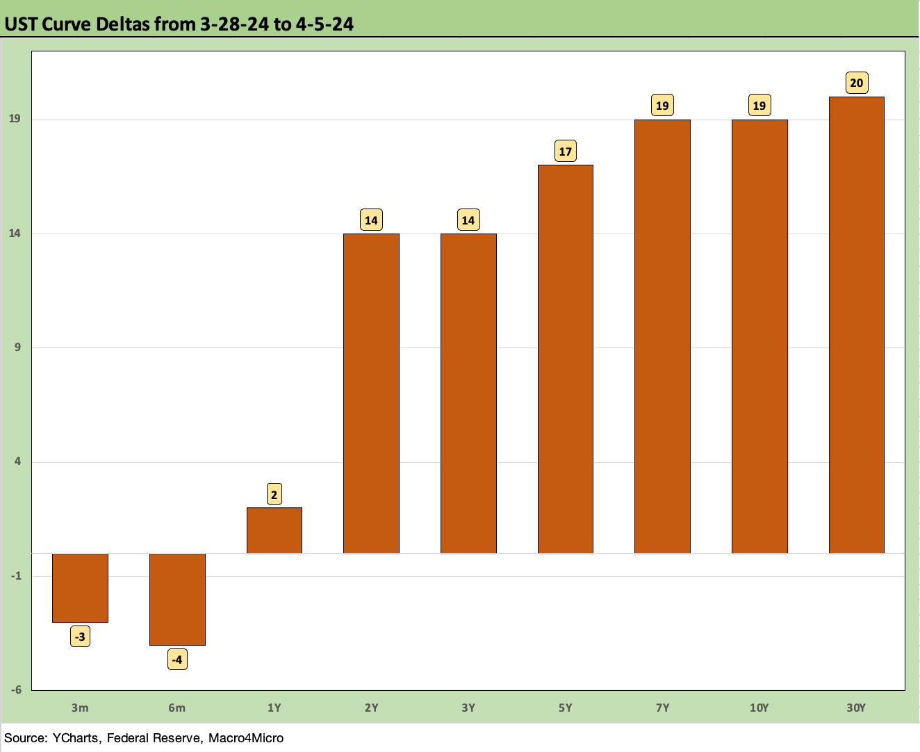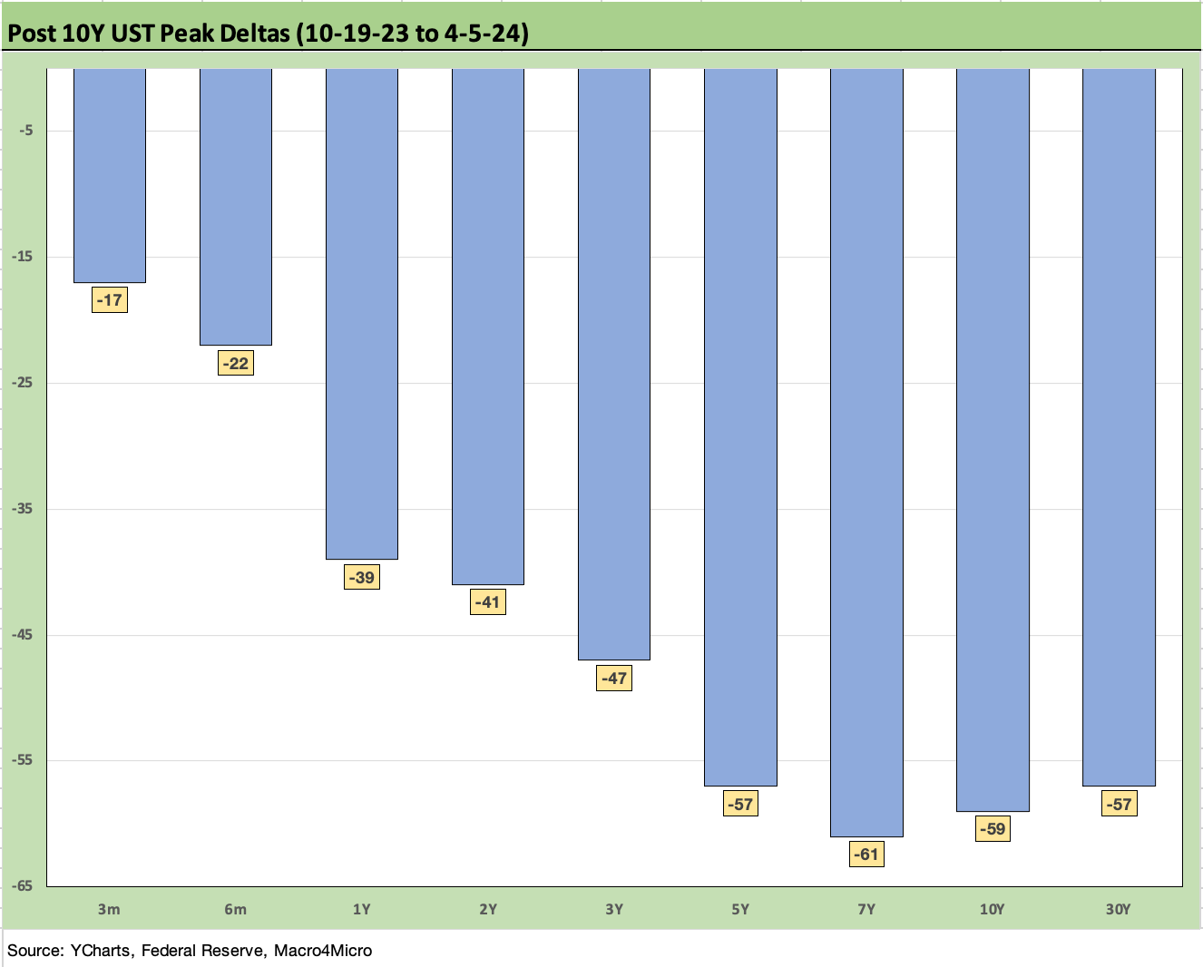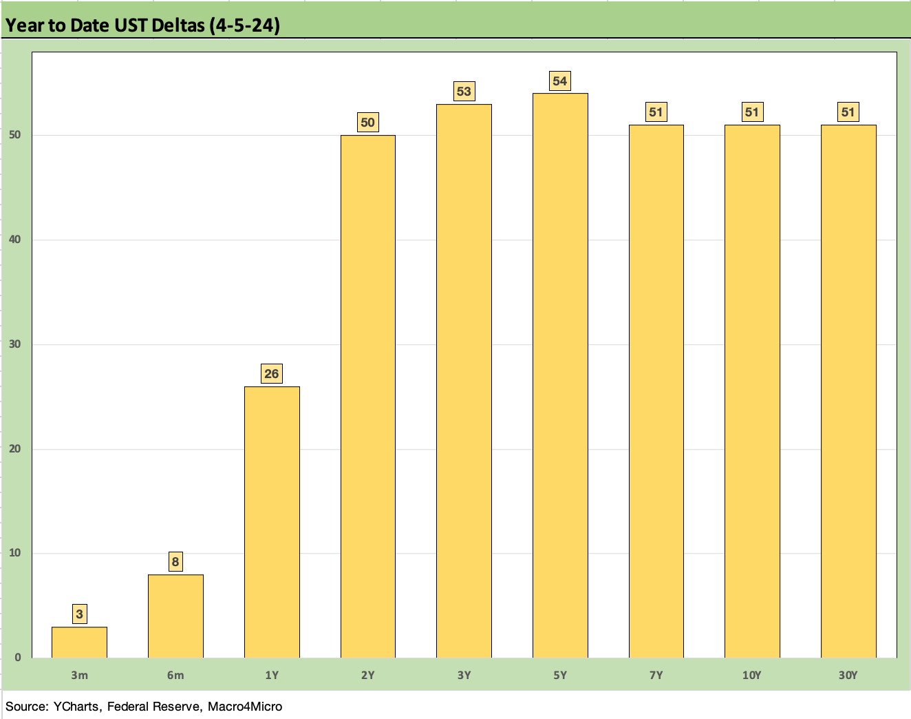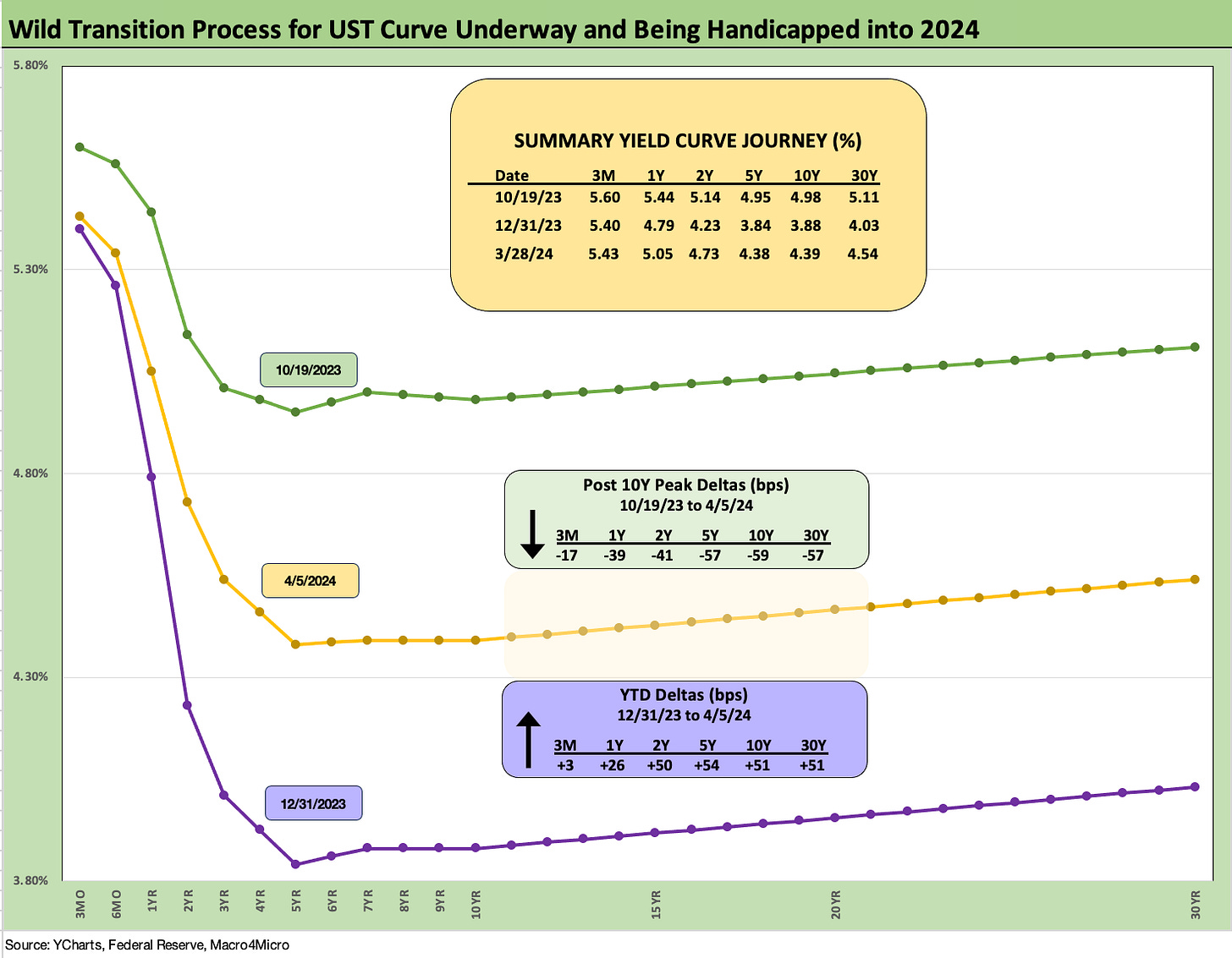 The above chart updates the UST moves from the peak date for the 10Y UST (10-19-23). We also updated the YTD UST move to the end of last week. The material shift lower from the third week of Oct 2023 has been addressed in detail in past commentaries, and there is no fighting the tape on the negative impact on duration returns across the YTD period as we covered in a separate Footnotes publication on asset returns posted earlier today (see Footnotes & Flashbacks: Asset Returns 4-7-24).