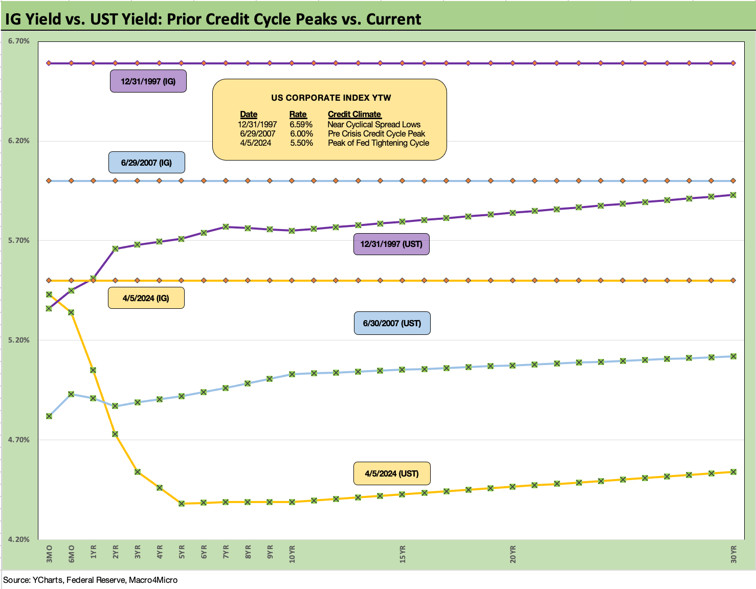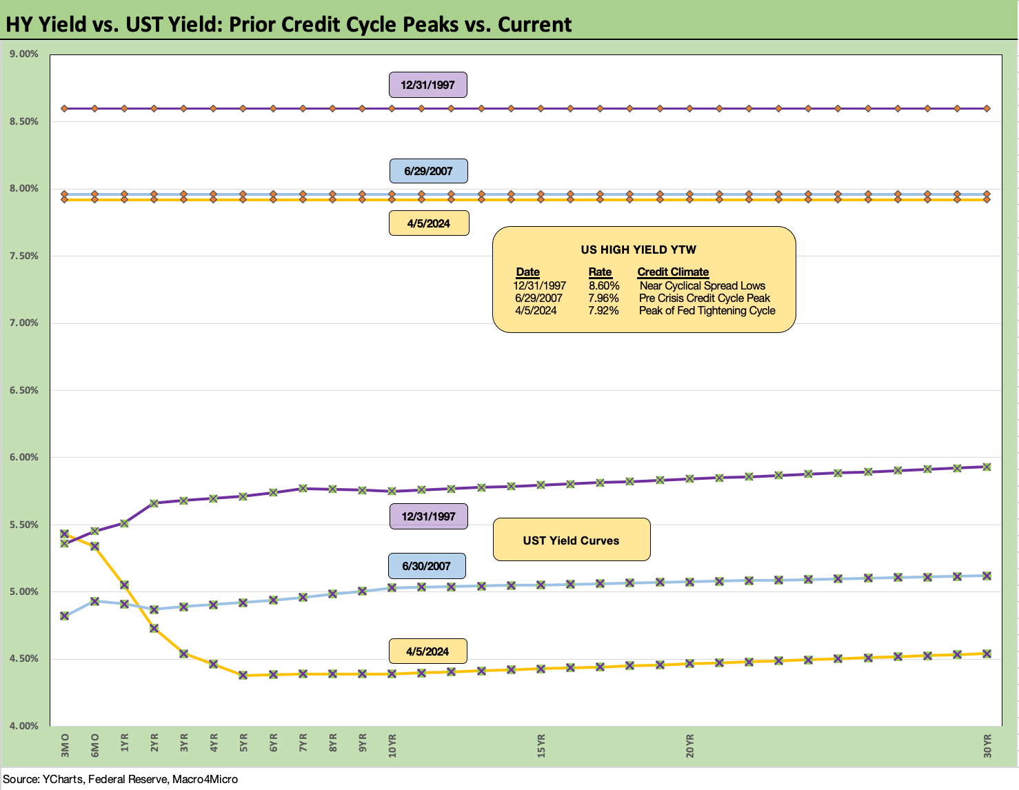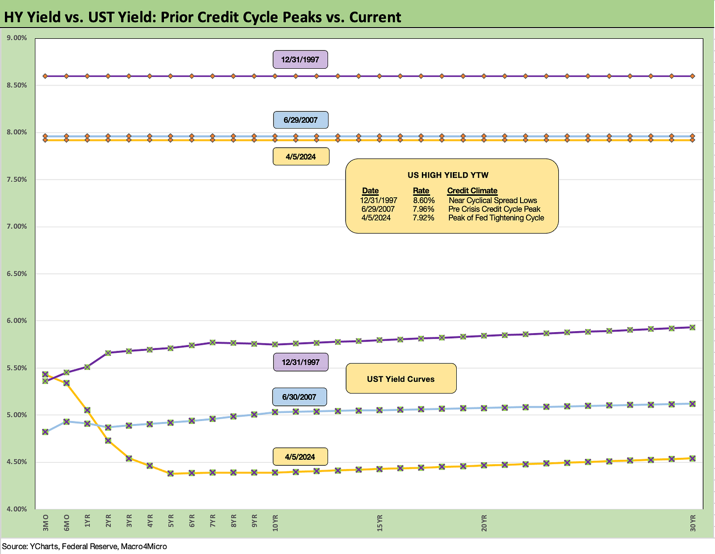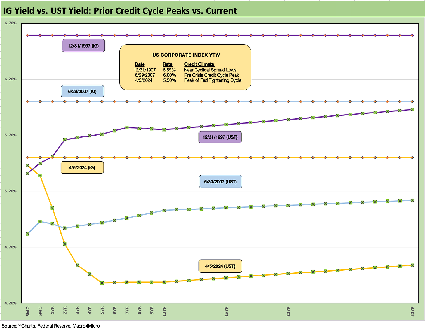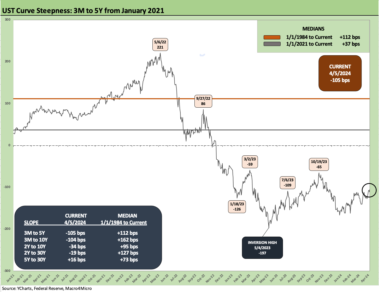 The above chart updates the UST moves from the peak date for the 10Y UST (10-19-23). We also updated the YTD UST move to the end of last week. The material shift lower from the third week of Oct 2023 has been addressed in detail in past commentaries, and there is no fighting the tape on the negative impact on duration returns across the YTD period as we covered in a separate Footnotes publication on asset returns posted earlier today (see Footnotes & Flashbacks: Asset Returns 4-7-24).