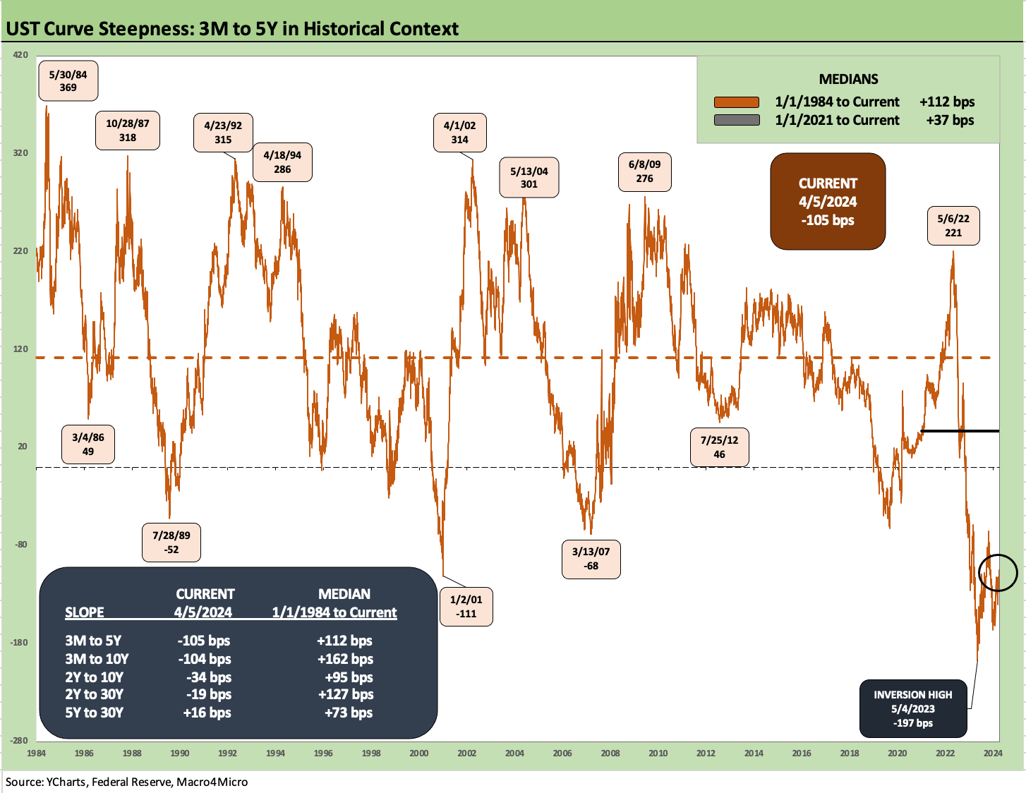 The peak inversion for 3M to 5Y UST was -197 bps in early May 2023. The box in the chart above breaks out all the current levels and long-term medians. The long-term median since 1-1-84 for 3M to 5Y is +112 bps. That is a long way off and would require multiple cuts with little movement in the 5Y UST.