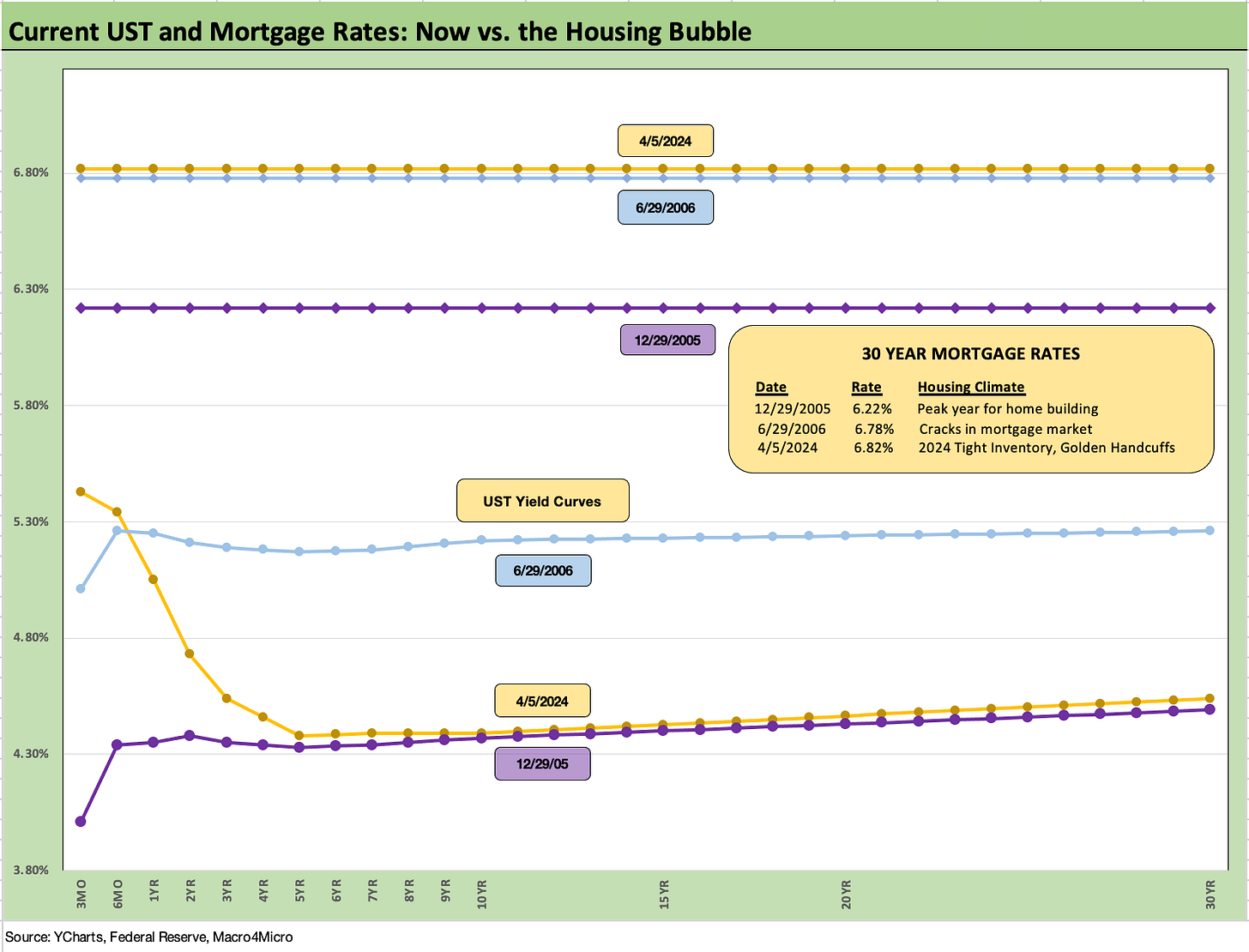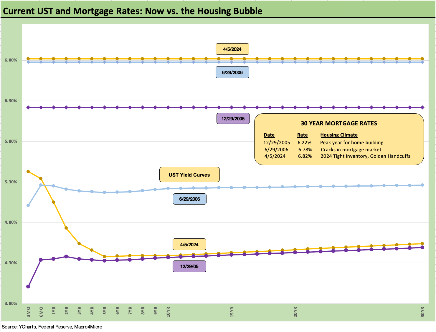 We note that all three periods posted 6% handle Freddie Mac 30Y levels, but the current UST curve is now slightly above 2005 in the 10Y area but much lower than 2006. The current UST curve just shifted above 2005 this past week. Despite that UST relationship, the current mortgage rates seen this past week are slightly higher than 2006 and above the 2005 level as noted in the box.