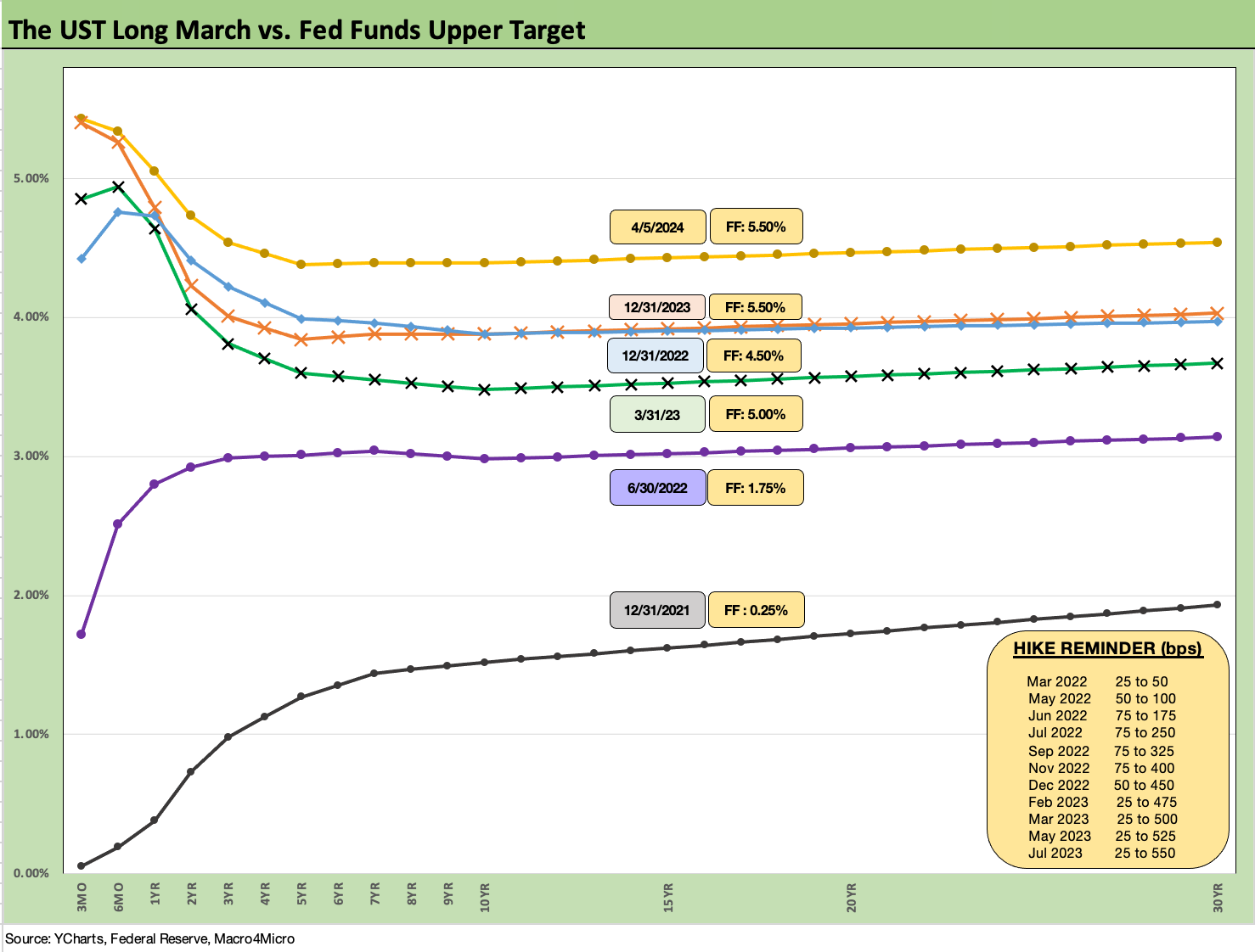 The above chart tracks the journey from the end of 2021 across key time periods in the tightening cycle. The path shows the UST downshift in March 2023 when the regional bank crisis flared up before resuming the path higher to the end of 2023. We include a memory jogger on the dates and magnitude of the FOMC action across the tightening cycle.