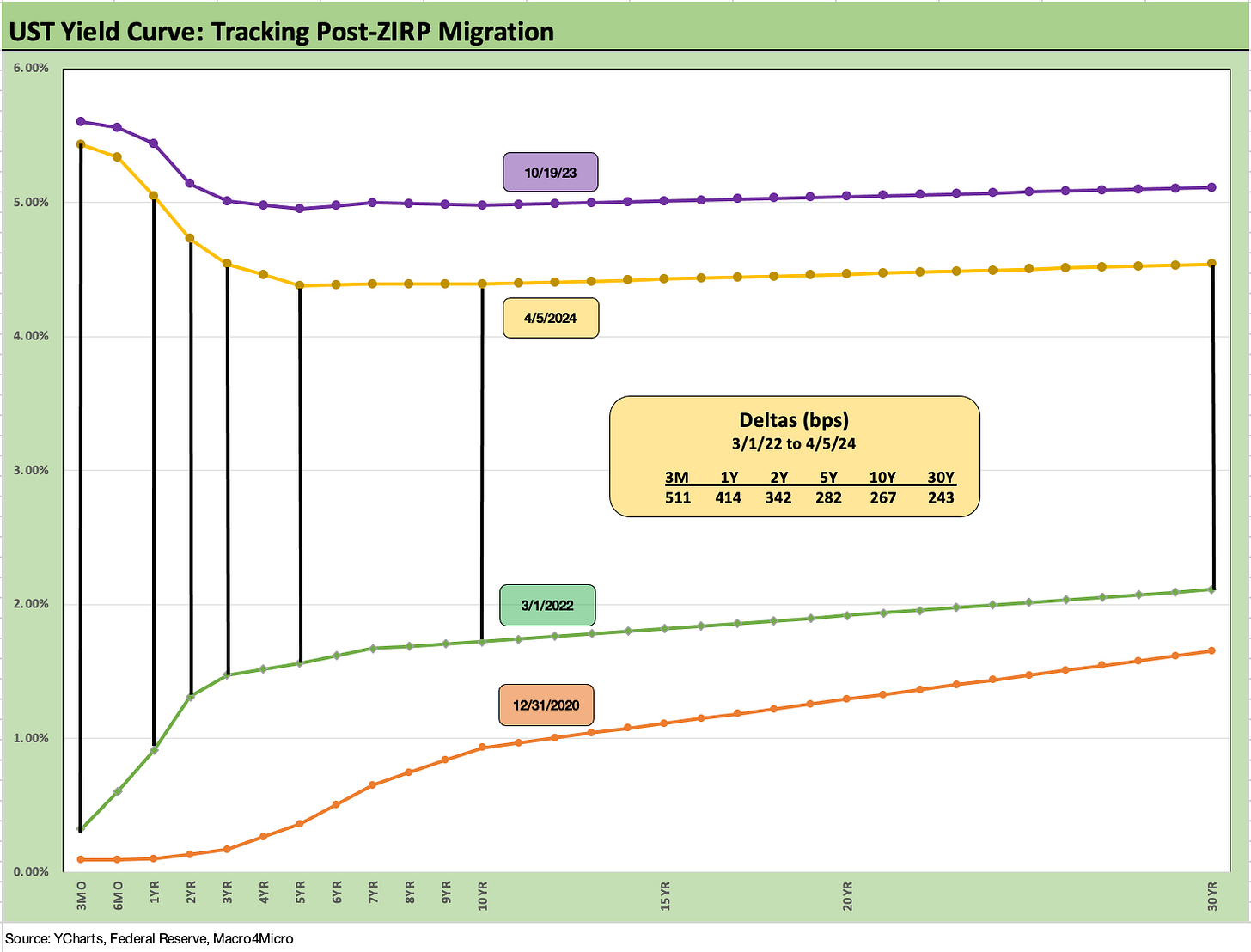 We wrap with our running migration chart that breaks out the UST deltas from the beginning of March 2022, the month ZIRP ended (effective March 17, 2022). The 12-31-20 UST curve is plotted as a frame of reference, and we also include the UST curve from the peak date (10-19-23) for the 10Y UST. The journey from ZIRP and upward sloping to flat to inverted has been a wild ride that punished bonds as detailed in our asset return commentaries.