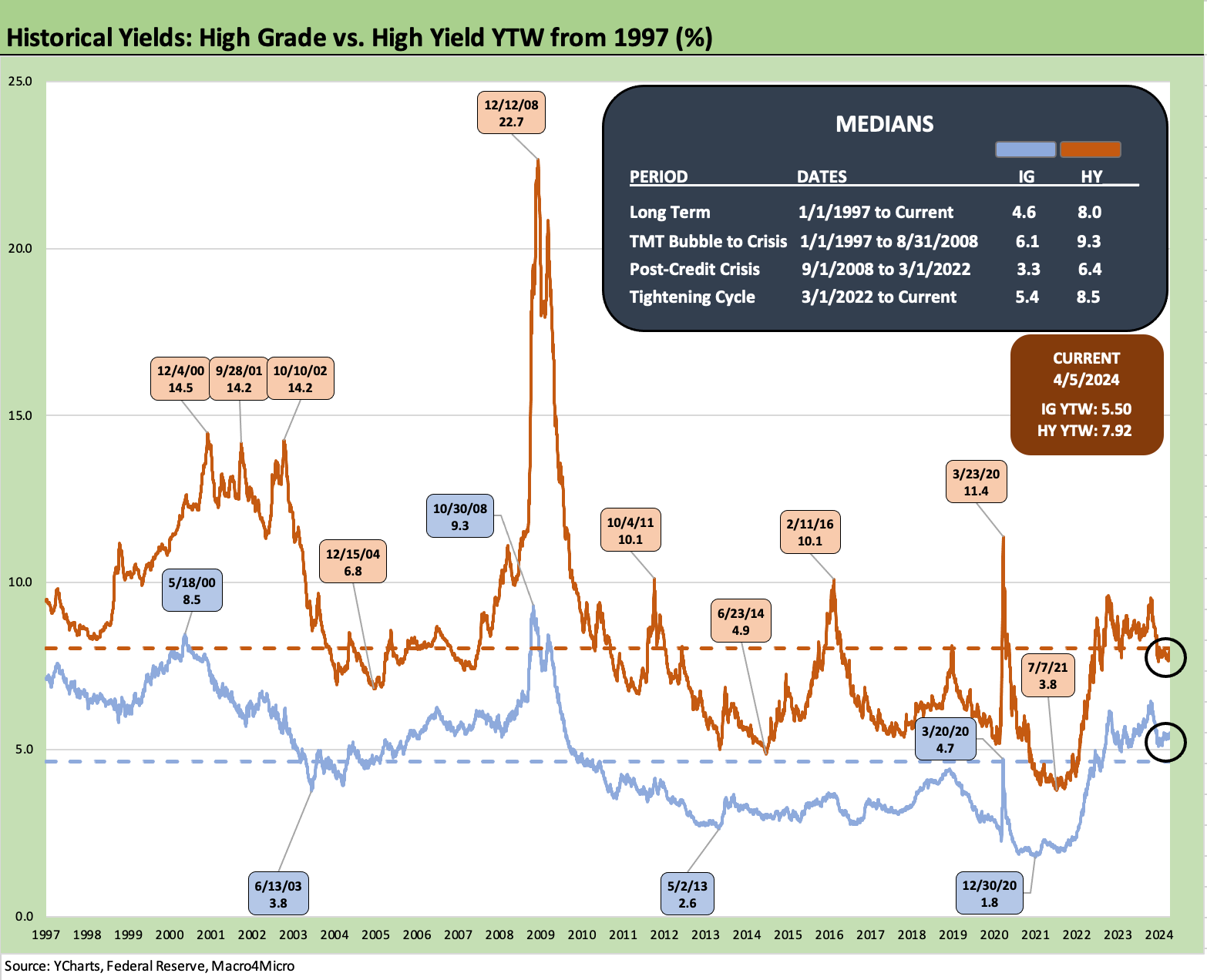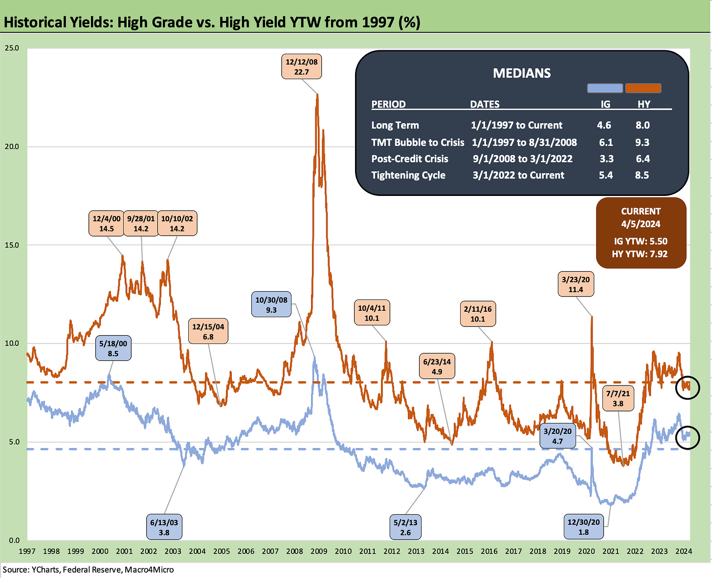 The above chart updates the running timeline for IG and HY yields (YTW). As we have covered in prior commentaries, the pre-crisis medians (9.3% for HY, 6.1% for IG) as posted present the best frame of reference after the protracted periods of ZIRP and QE seen since the credit crisis and later during the pandemic.