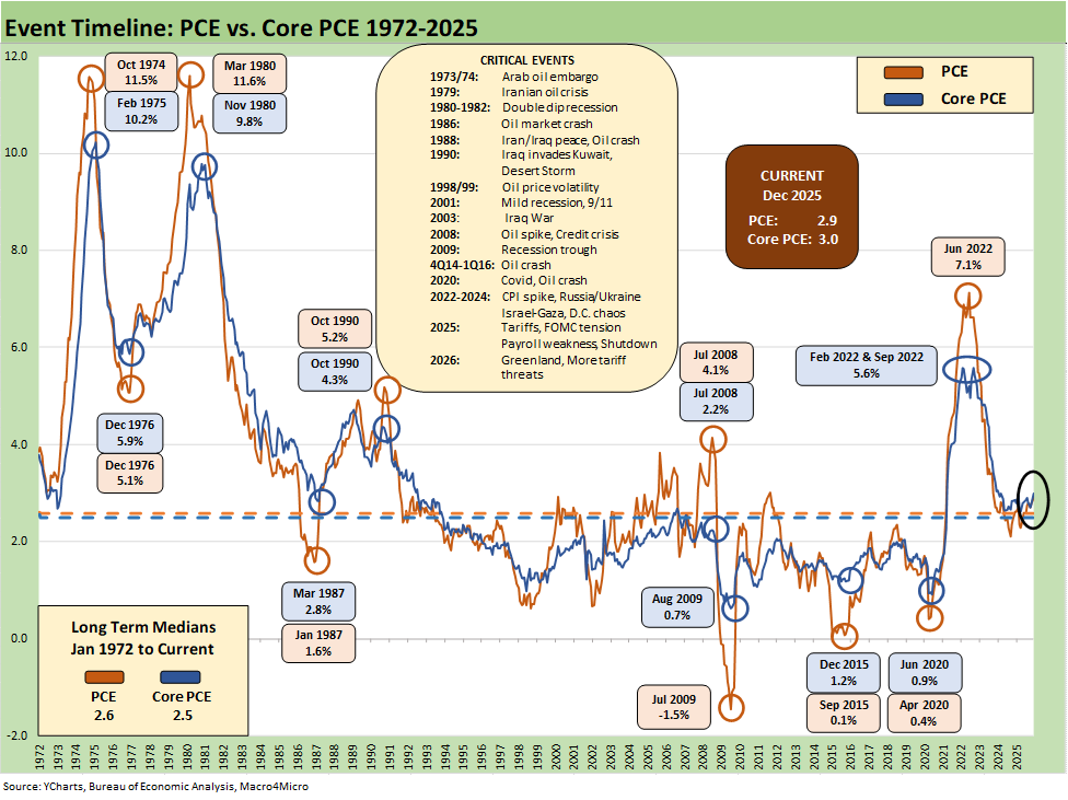 The above chart is one of those memory lane moments across the cycles. The message is inflation is higher today vs. history as we saw in the PCE inflation release of Friday (see PCE Income & Outlays Dec 2025: Inflation Reversal? 2-20-26). Those medians noted in the box on the lower left (2.6% headline, 2.5% core) are part of a crazy Hi-Lo range of interest rates and inflation of years gone by whether PCE or CPI (see CPI Jan 2026: Reassuring Numbers, Missing Pieces 2-13-26).