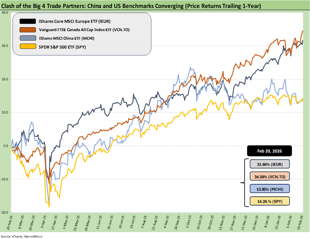 The above chart frames the total returns of some benchmark ETFs that detail the performance of the trade partners highlighted above (Europe, Canada, China). The returns include currency effects, which has been a drag on US performance. The US finally edged ahead of China the past week after spending months at #4.
