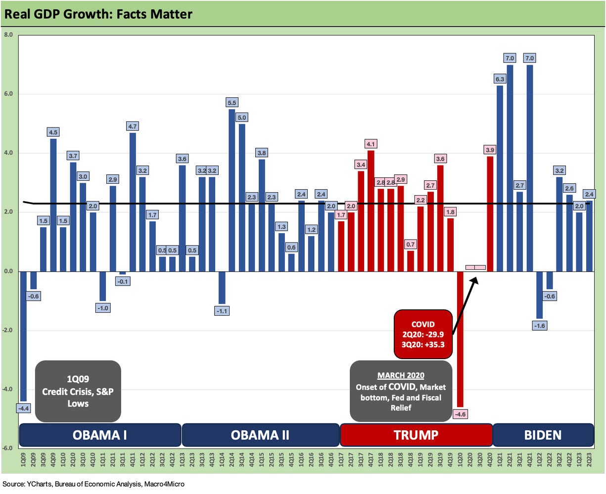If Biden ends the full year at a 2% annual GDP number following a 2% annual 2022 number, we don’t expect Trump and Biden to run on the platform of “We ran economies just like the other guy with low growth and a lot of policy acrimony.” It just doesn’t lend itself to a good commercial. Biden has had to experience exogenous shocks (the COVID adjustment period) just as Trump did. Obama inherited a credit crisis that was less fatal to humanity but far more damaging economically with protracted credit contraction and high unemployment.