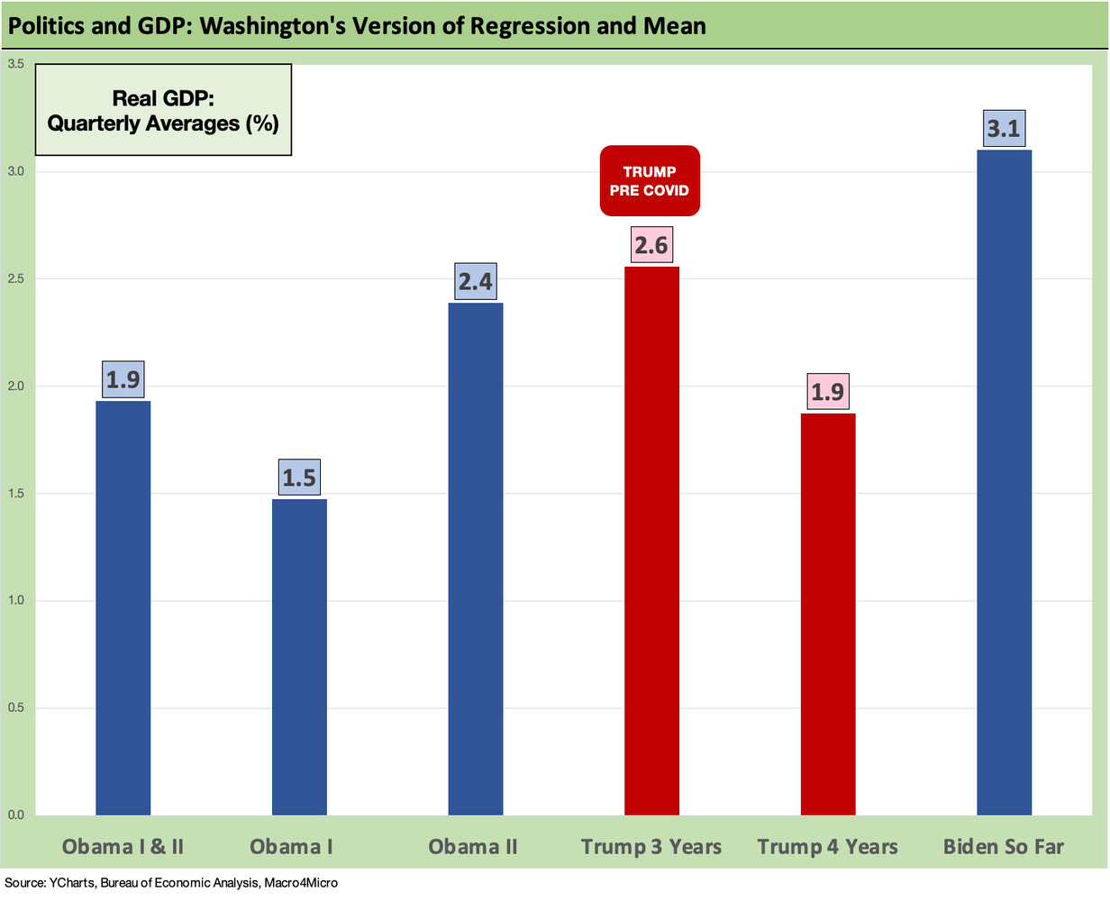 Some prior administrations have posted volatile swings across quarters (Obama first term coming out of the credit crisis) and some printed weak numbers in a narrow range (the first 3 years of Trump). The above chart just posted a simple average of the quarters. Coming off the disastrous year of 2020 and COVID, the market was almost assured a high annual growth rate in 2021. A great quarter can come after a very bad quarter, so we prefer to use the annual numbers from the BEA as a guide on how the timelines look for growth as pundits score policy outcome. GDP growth is one of various areas to score (employment next in line).
