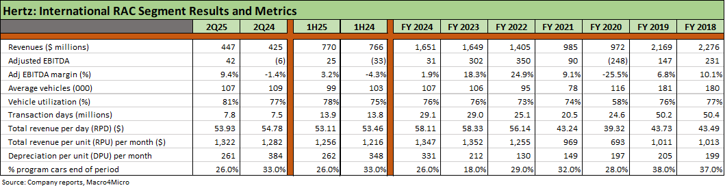 The segment fleet size was lower YoY in 2Q25 and 1H25, but utilization has improved. Management cited a fleet age that showed 80% under 1 year. Market pricing was “challenged” (RPU), and HTZ still has a target of $1500 per month. Costs at $248 per unit was a solid improvement and inside the Hertz “North Star” target of $300.