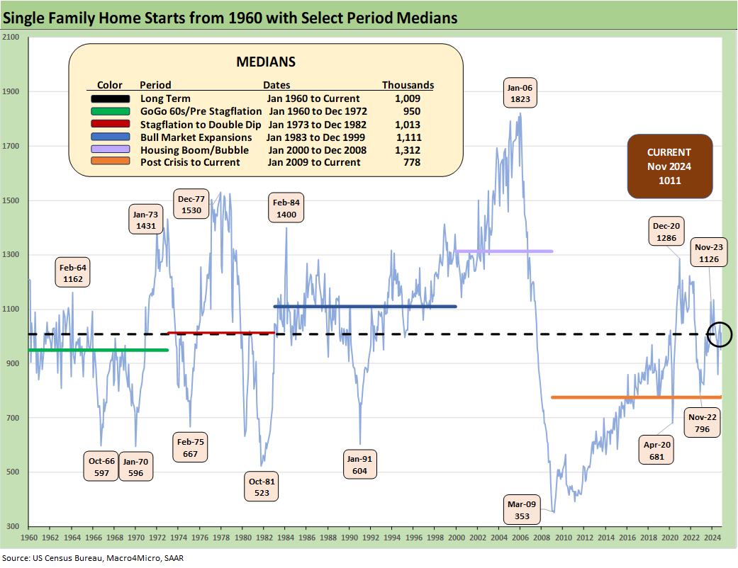The above time series updates single family starts, and the current 1,011K is slightly above the long-term median of 1,009K noted in the box. The current level is in the zone of the 1980s/1990s bull markets (1,111K), but well below the early 2000s housing bubble boom median (1,312K).