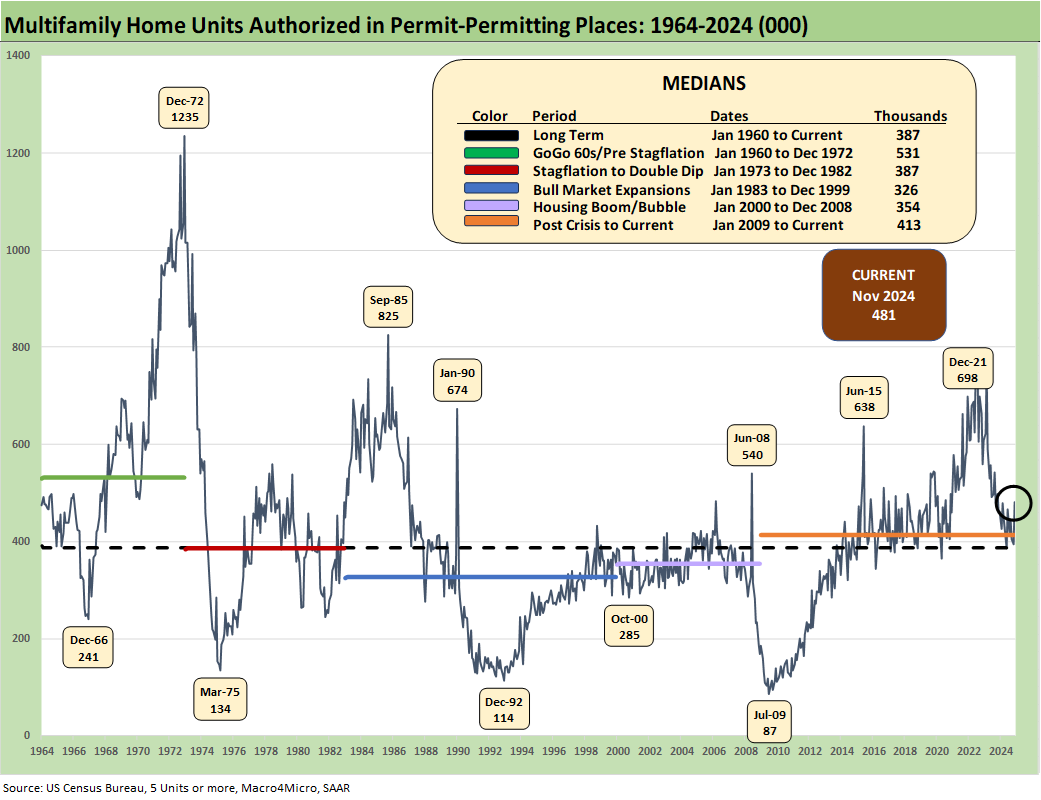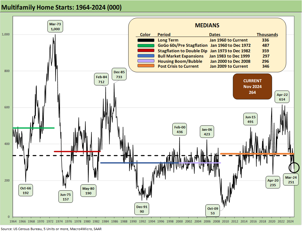 Multifamily continued its ratcheting moves lower in Nov with a -24.1% MoM decline to 264K. That is the worst multifamily starts month since 251K in March. The YoY declined was -28.8%. The long-term median of 336K cuts across a few major but volatile multifamily cycles as we look back across the decades.