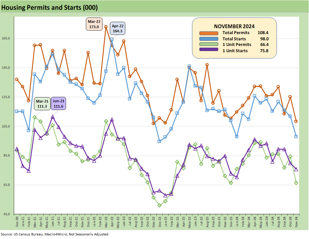 On a SAAR basis, starts were down sequentially by -1.8% MoM but down -14.6% YoY. Single family was up +6.4% MoM but down by -10.2% YoY. The outlier in the SAAR mix was a favorable MoM move in the South at +18.3% and down by only -1.6% YoY. The South comprised 61% of single family starts in total during Nov 2024 on a SAAR basis and over 56% of total starts (SAAR).