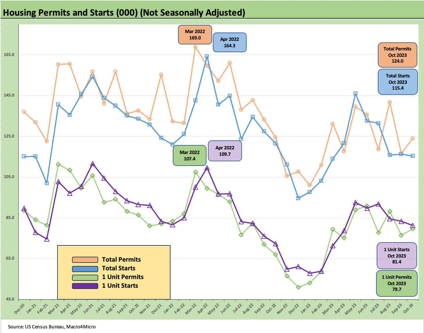 The above chart shows multifamily permits running much weaker YoY (-27.8%) but remaining resilient sequentially (+2.2%) even if well below the 500K handles mostly seen in 1H23. On a not seasonally adjusted basis, Oct 2023 was near the lower of the last 12 months with April 2023, July 2023, and Sept 2023 slightly lower.