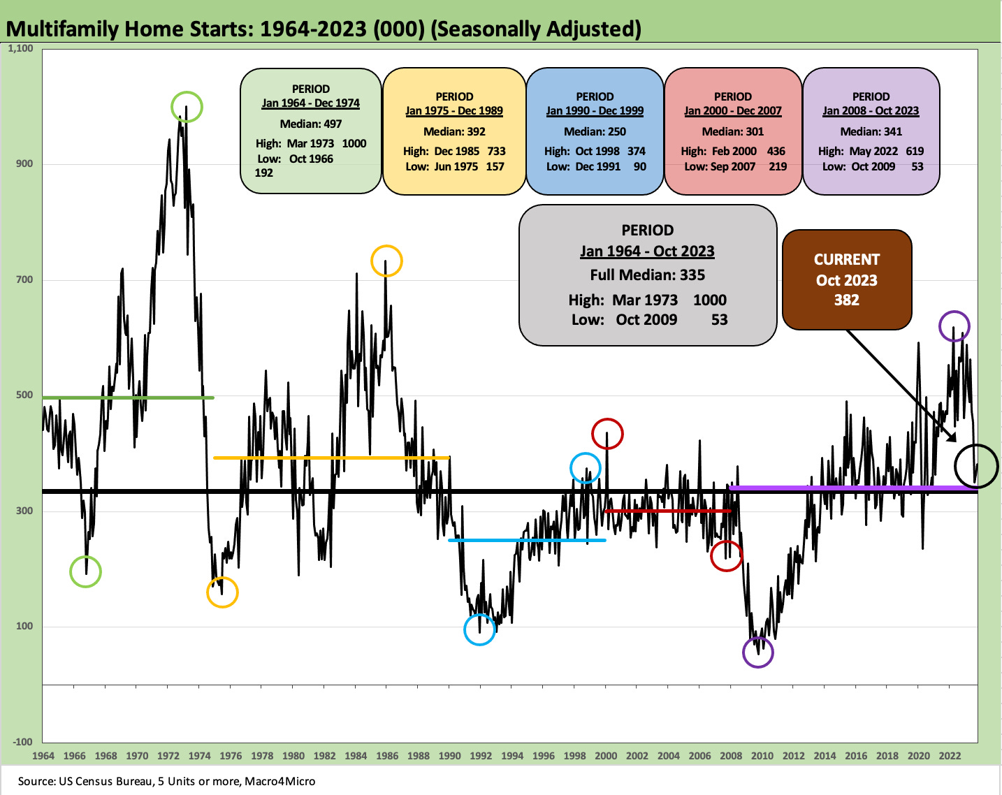 The 5+ units numbers on a SAAR basis remain high even if below the July-Aug 2023 peaks. On a YoY basis, multifamily units “under construction” are +8.3% with so much activity stoked up across 2023. Multifamily units “completed” remain high in 2023 and are up +14.3% YoY Oct 2023 with “not seasonally adjusted” at +23.6% YTD Oct 2023 vs. YTD Oct 2022.