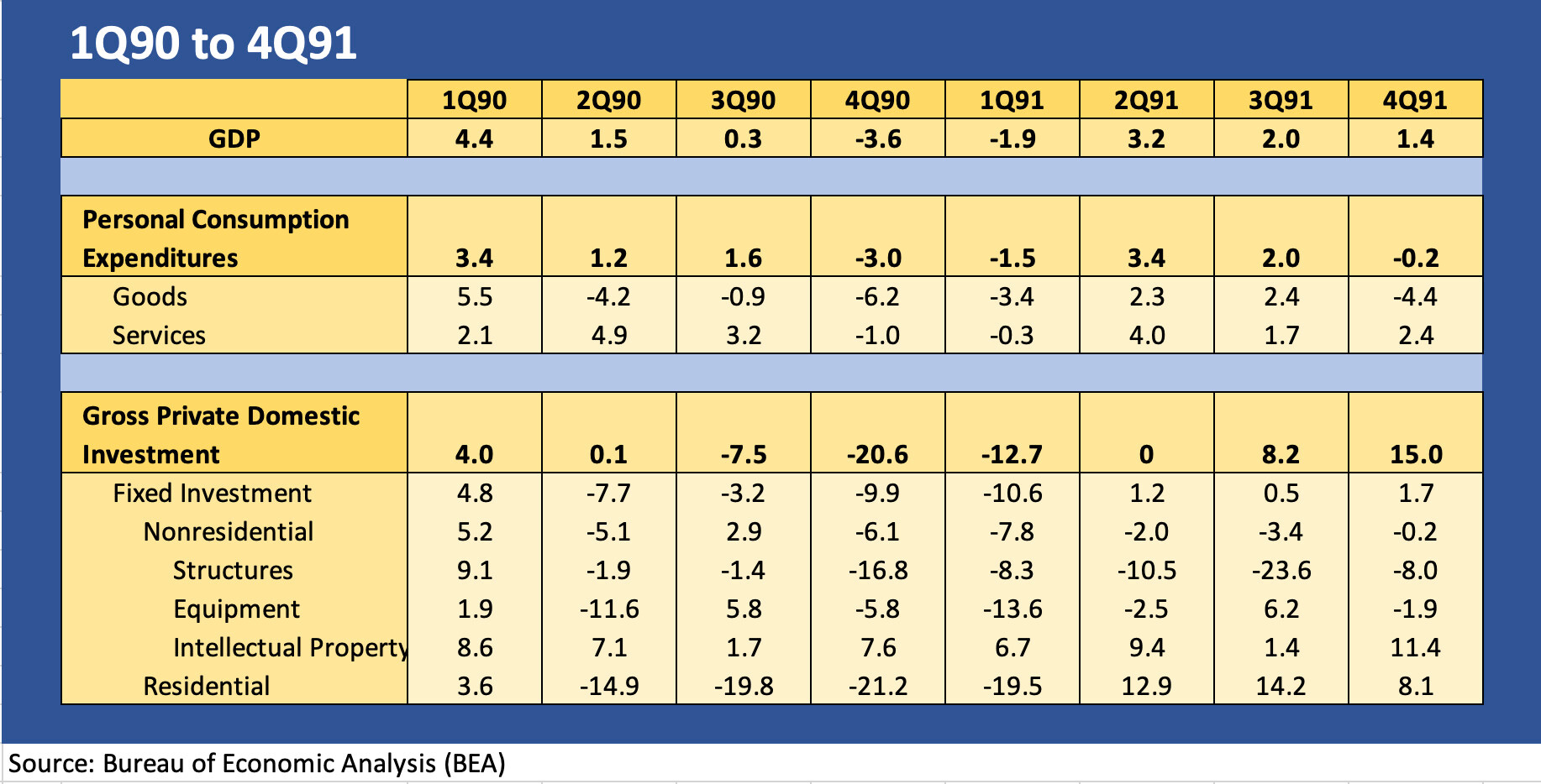 We see two negative PCE contractions in 4Q90 and 1Q91 quarters (during the Gulf War scare, the spike in oil, and as cascading problems peaked in the financial system). The contraction in Structures was material and painful and came with a national scale commercial real estate correction that hit many banks hard including a number of major regionals that failed.