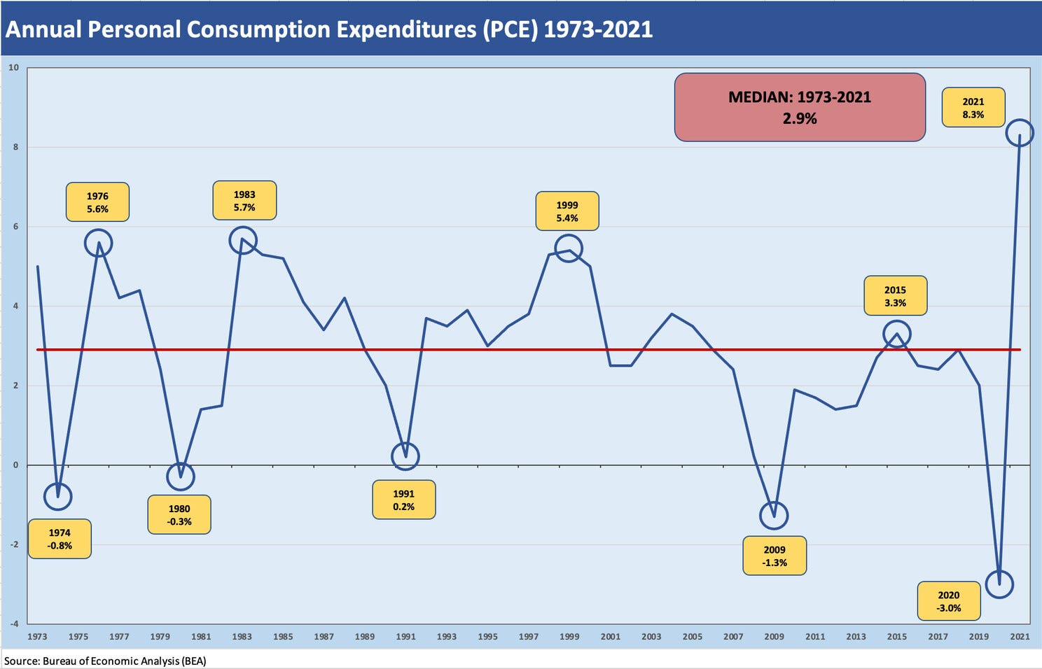The PCE time series above frames some highs and lows across the cycles and details a median of just under 2.9%. The annual PCE low points across the long term timeline are muted vs. the 2% handle GDP growth numbers typically seen. At -3.0%, COVID is the notable exception. The -1.3% after the credit crisis underscores the resilience of the PCE line driven by a growing population. The COVID pandemic stands alone in scale for its PCE impact - negative and positive. Such a deep cut turned around to generate the highest PCE on the chart in 2021. Distortions created by especially ugly downturns also give rise to outliers on the upside.