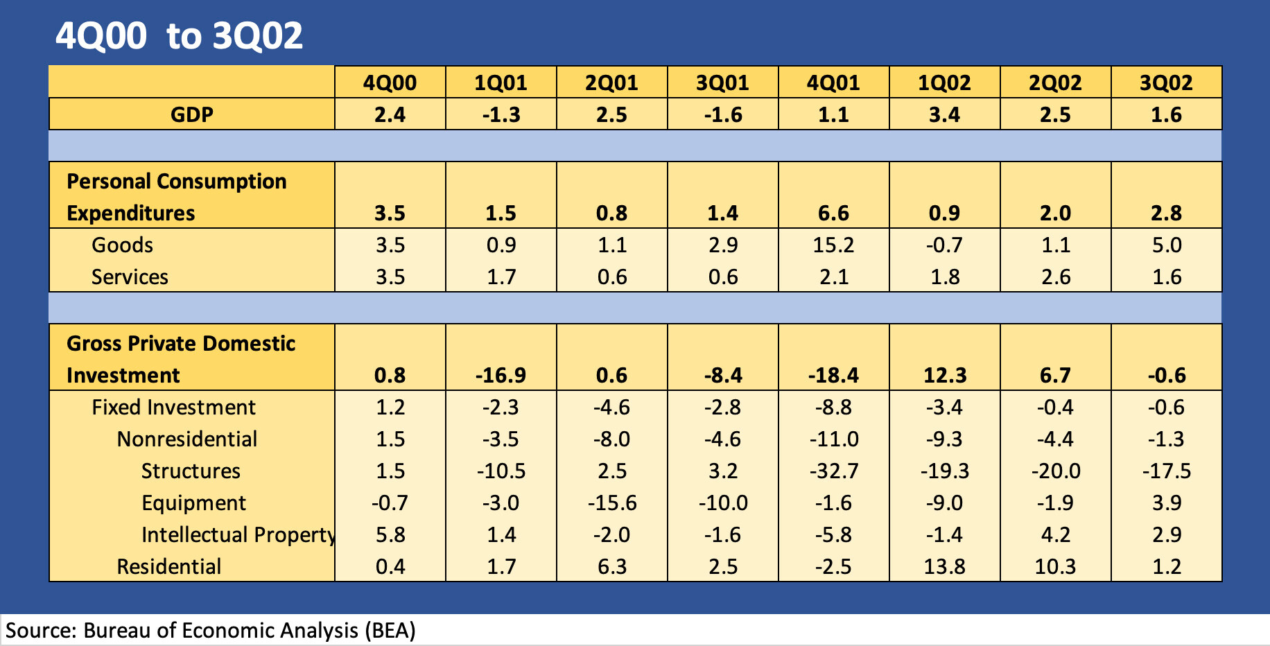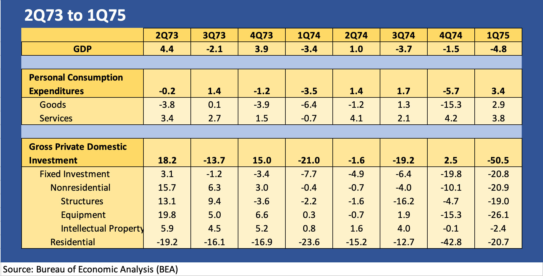 We review PCE and fixed investment lines for the quarters around the recession periods back to the 1973-1975 stagflation.