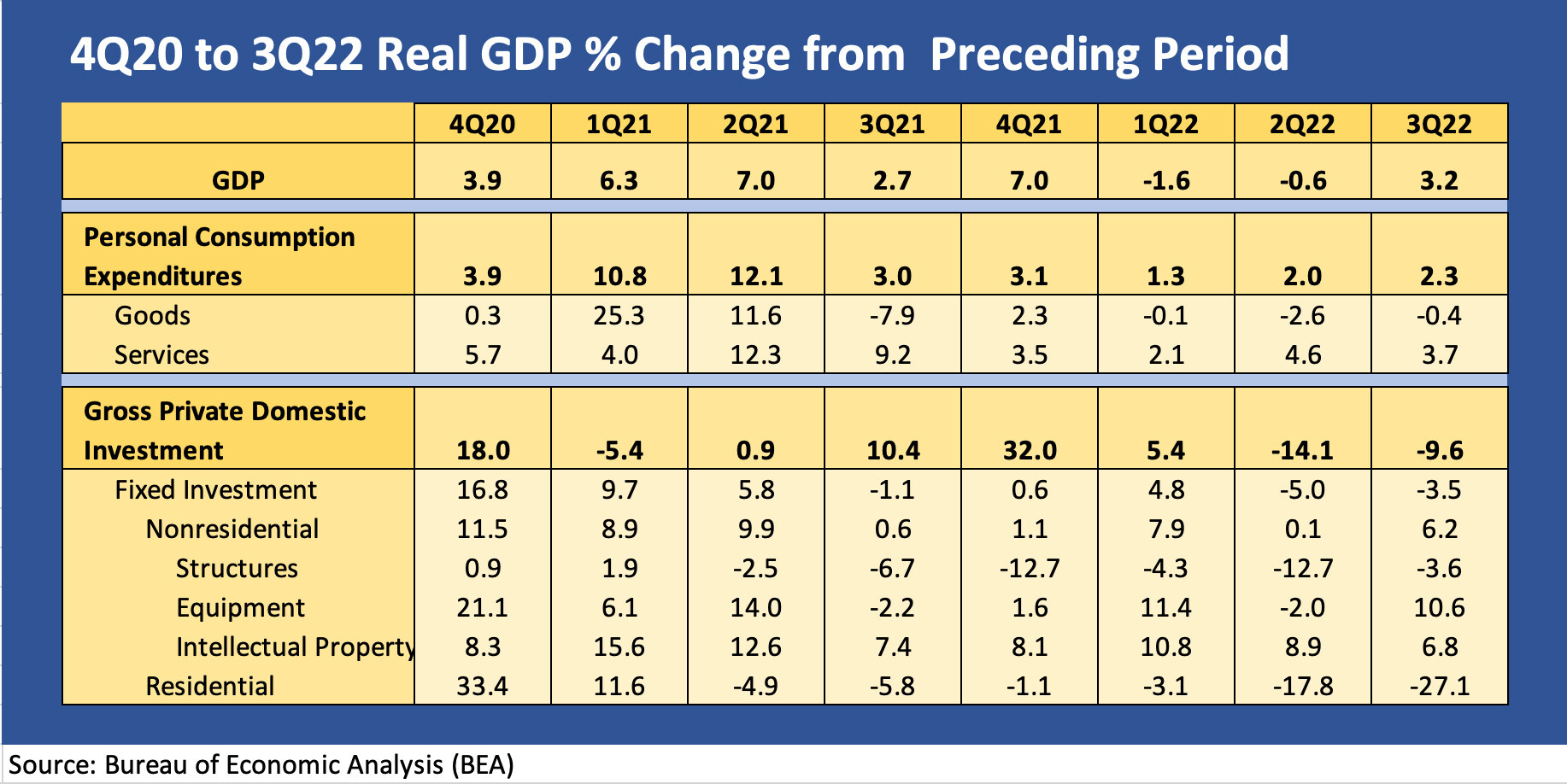 The GPDI line is where a big part of the story will get told in 2023. The weight of Fed hikes and inflation takes time to roll through the system and for layoffs to take effect on planning by producers of goods and services. The GPDI line is where 4Q22 earnings season might help give some directional clues on which sectors will be increasing or decreasing across Structures (e.g., investment in construction, additions to properties in health care, commercial, and industrial, etc., plus E&P drilling outlays), Equipment (e.g., capital goods, auto/truck/freight, non-defense aircraft, etc.,) and Intellectual Property (e.g., software, tech design and related services, arts and entertainment, etc.). On a side note, I don’t envy economists charged with forecasting all of that by rolling it up from the trenches and framing in BEA measurement context.