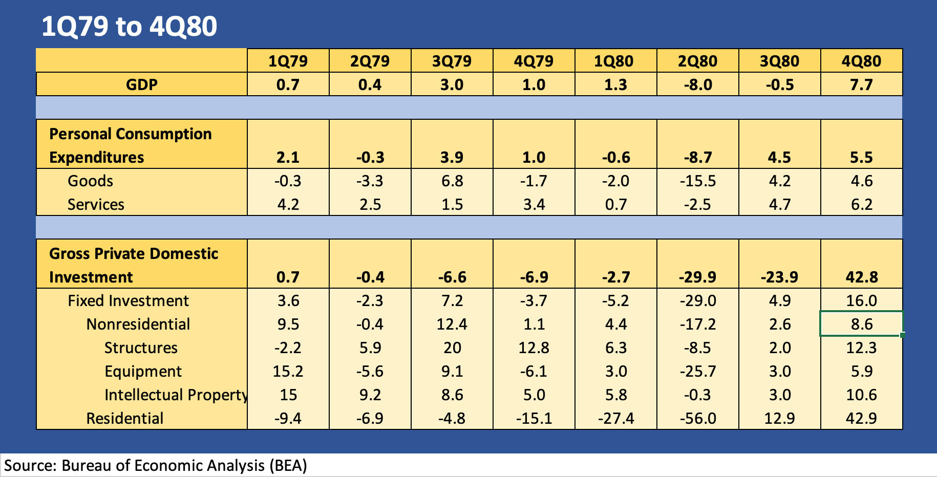 We see three negative PCE quarters from 2Q79 to 2Q80 with the recession months from the Jan 1980 peak to the July 1980 recession trough, including the market posting back-to-back negative PCE quarters during the 6-month recession. In GPDI, we see an ugly 2Q80 and 3Q80, but the numbers were recovering by the end of 1980. As we now know, the trouble returned, and the Fed tightened the vice again in late 1980s and in early 1981. Volcker kept the heat on, and that made the second leg worse in unemployment with contraction in manufacturing, construction, and housing. The Residential line was especially beaten down at the Misery Index peak. The 10% handle unemployment rates by late 1982 did the trick and brought inflation under control. The cycle turned.