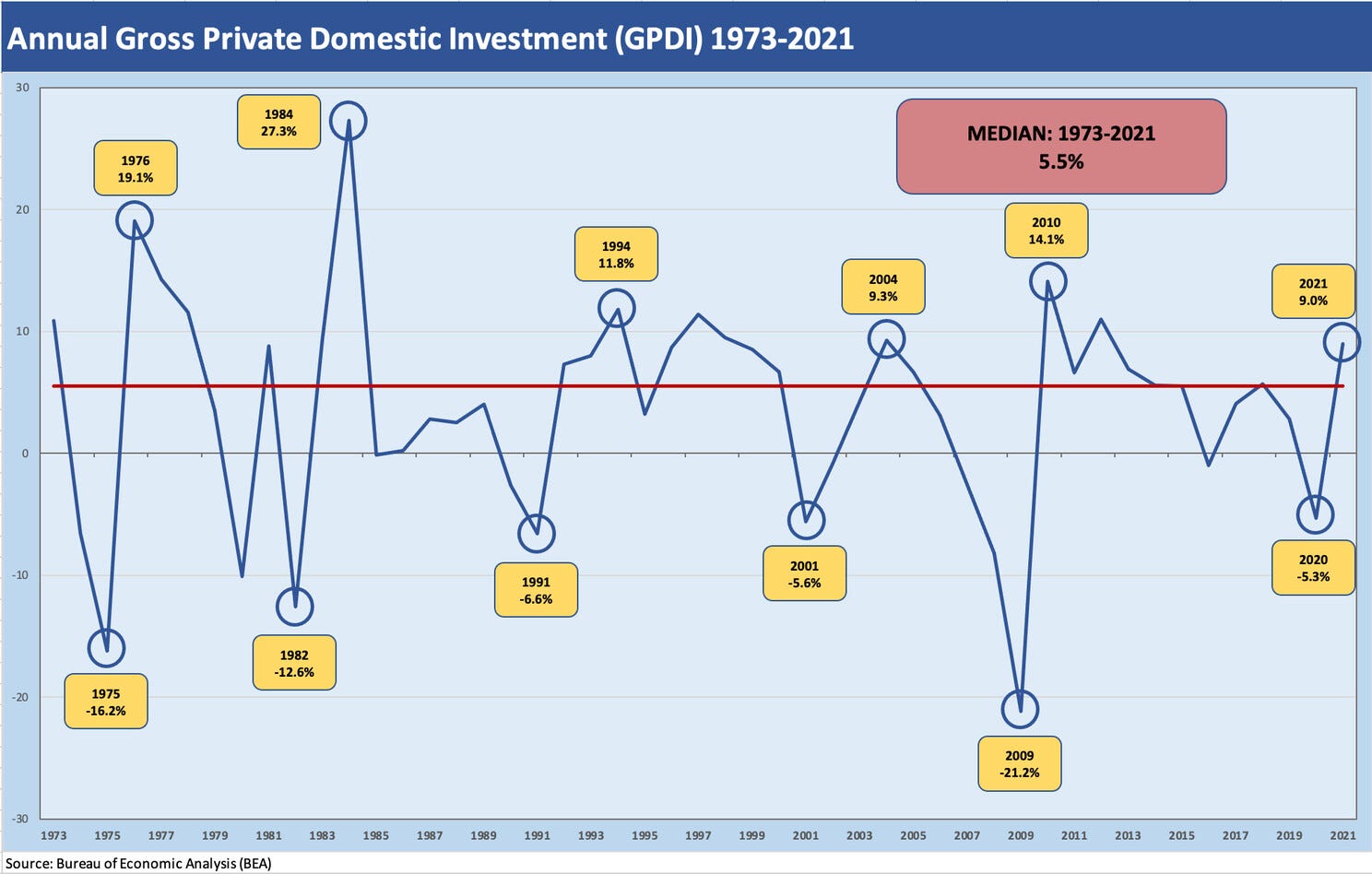 The 2% handle average annual GDP of the Obama and Trump years saw 12 years without getting north of a 2% handle annual GDP growth rate. Then GDP took a sudden move lower with COVID. However, GPDI put up a strong rebound year in 2021 ahead of the weakness that came in 2022, which saw two materially negative quarters as detailed in the chart collection below.