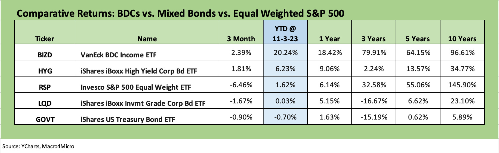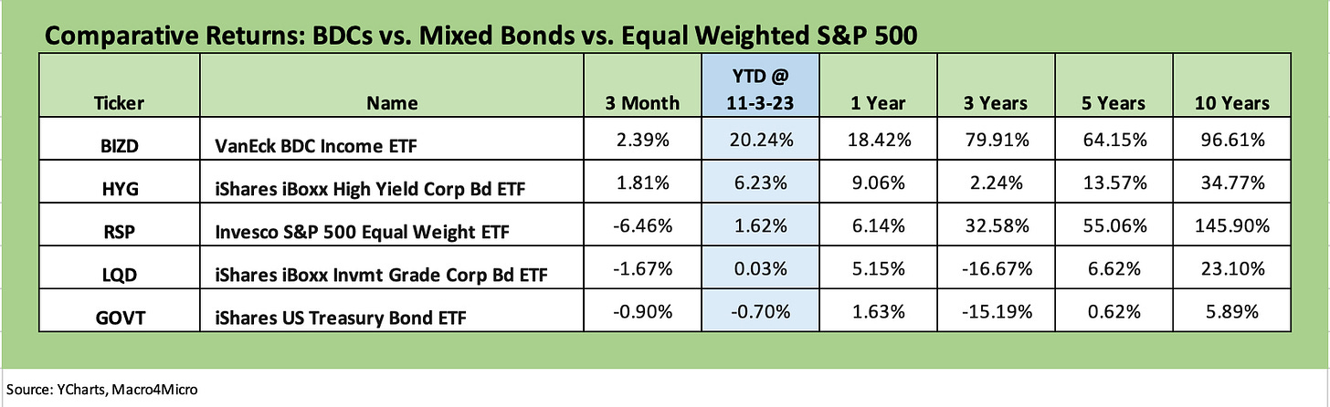 Below we post some notable fixed income and credit-based ETFs. We include the HY bond ETF (HYG), and IG bond ETF (LQD) and a UST ETF (GOVT). We also include a BDC ETF (BIZD) and an equal weighted S&P 500 ETF (RSP) to get a useful comp for equity market returns without all the Magnificent 7 distortions. BDCs are a credit market play but also are more tied into a floating rate asset and thus take the duration out of credit. There are other benchmarks to use, but these have the merit of daily pricing and liquidity.