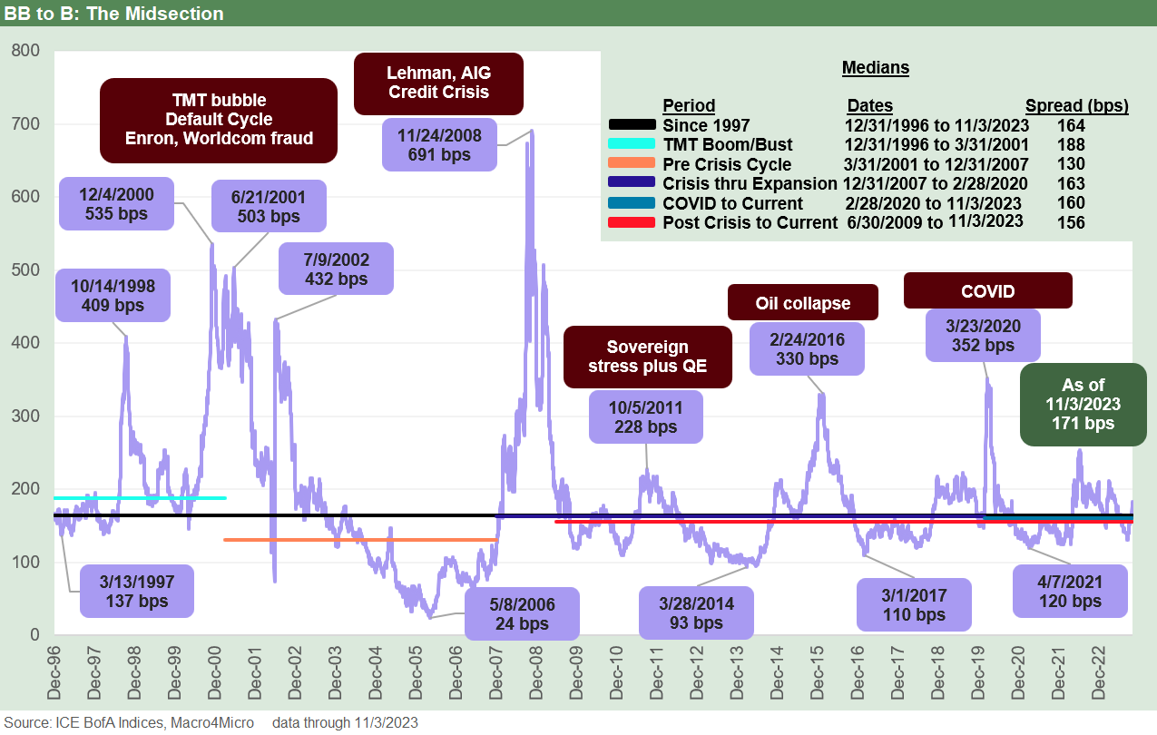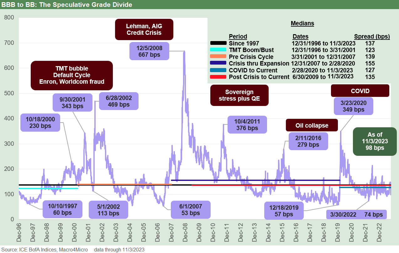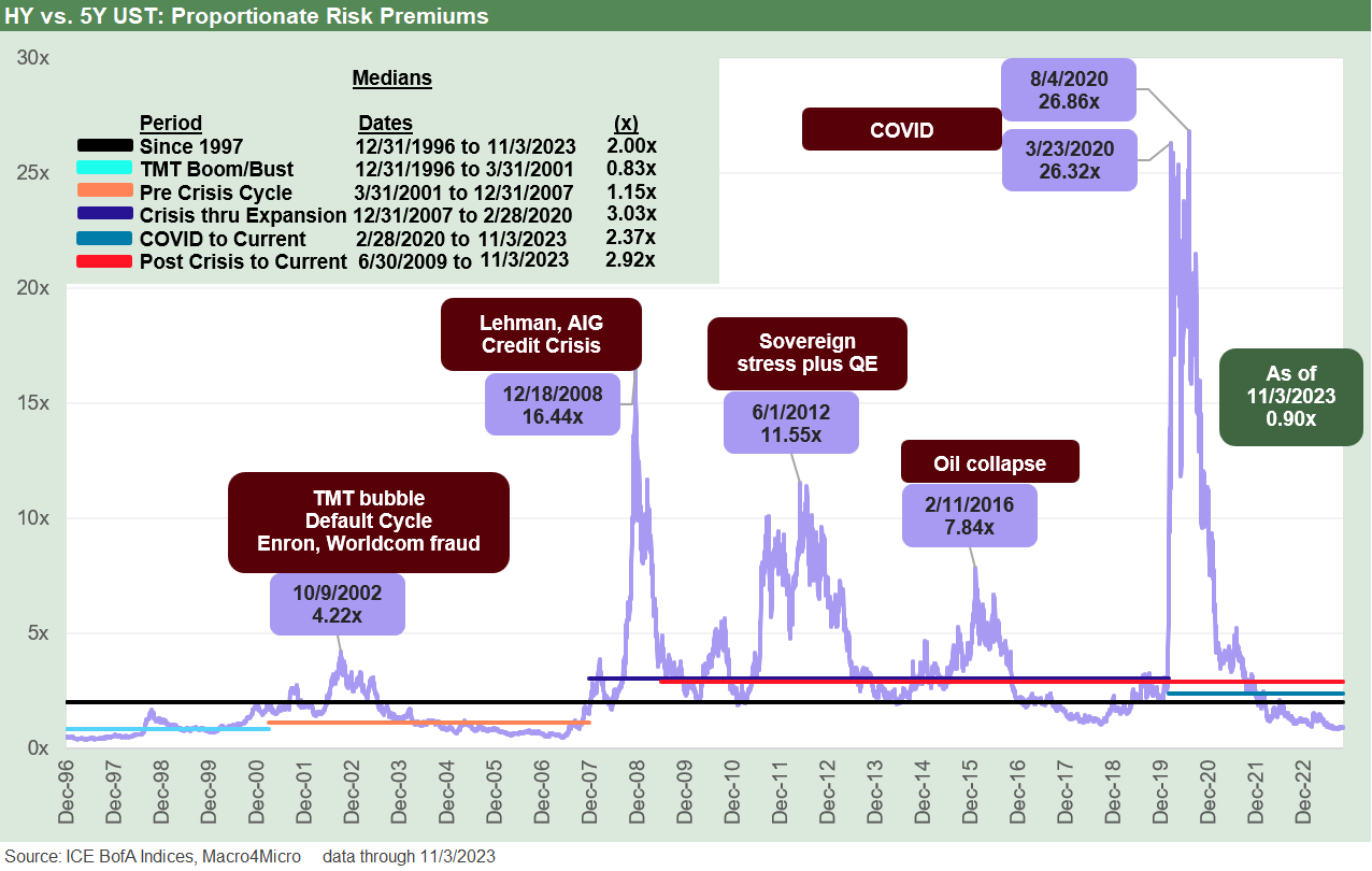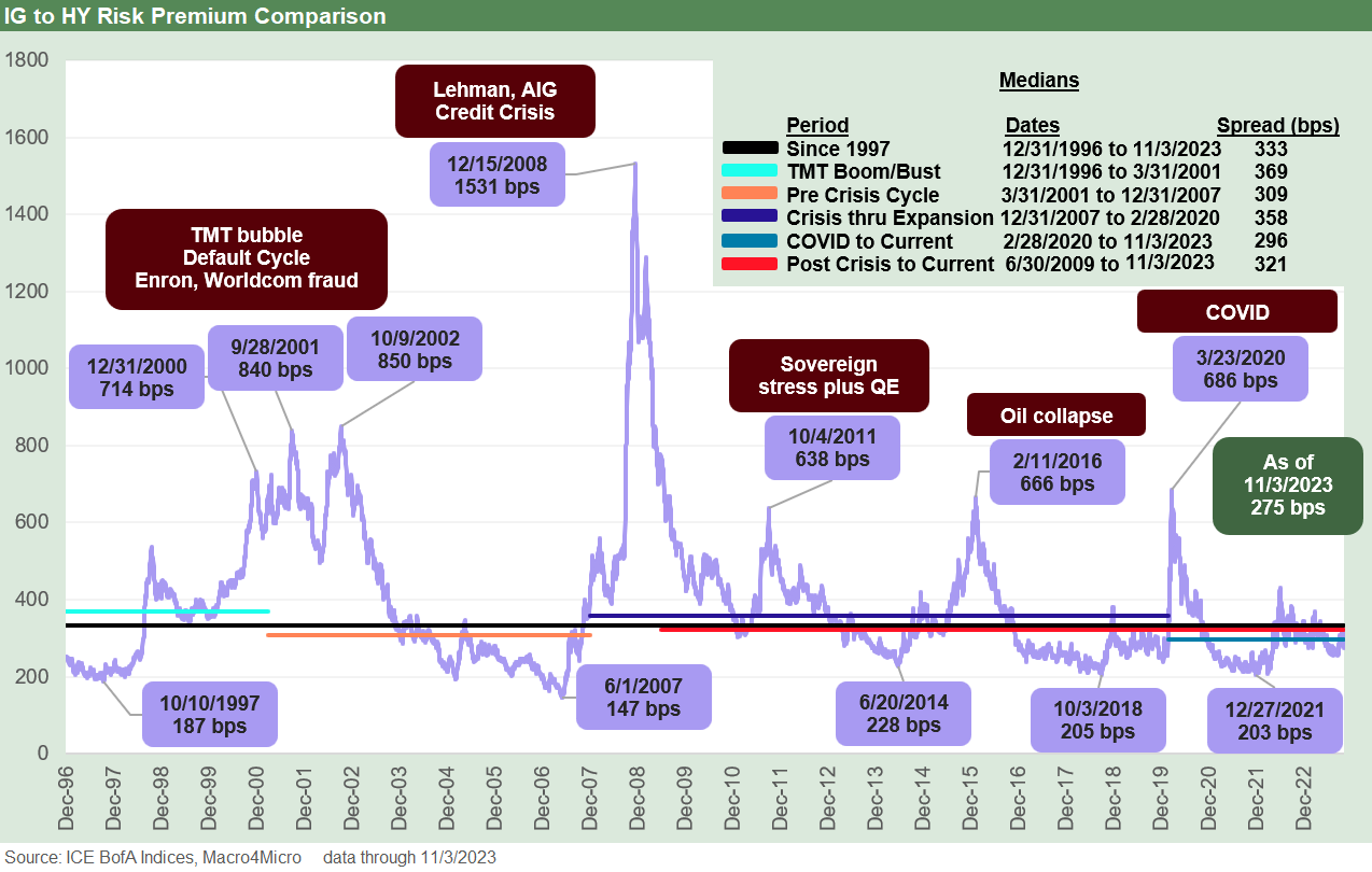 As we roll forward to the 2023 spread compression in HY, we just went through a sharp sell-off in risk in both equities and HY ahead of last week’s impressive one-week rally. We look at asset returns and curve action last week in our separate weekly Footnotes publications (see Footnotes & Flashbacks: Asset Returns 11-5-23, Footnotes & Flashbacks: State of Yields 11-5-23).