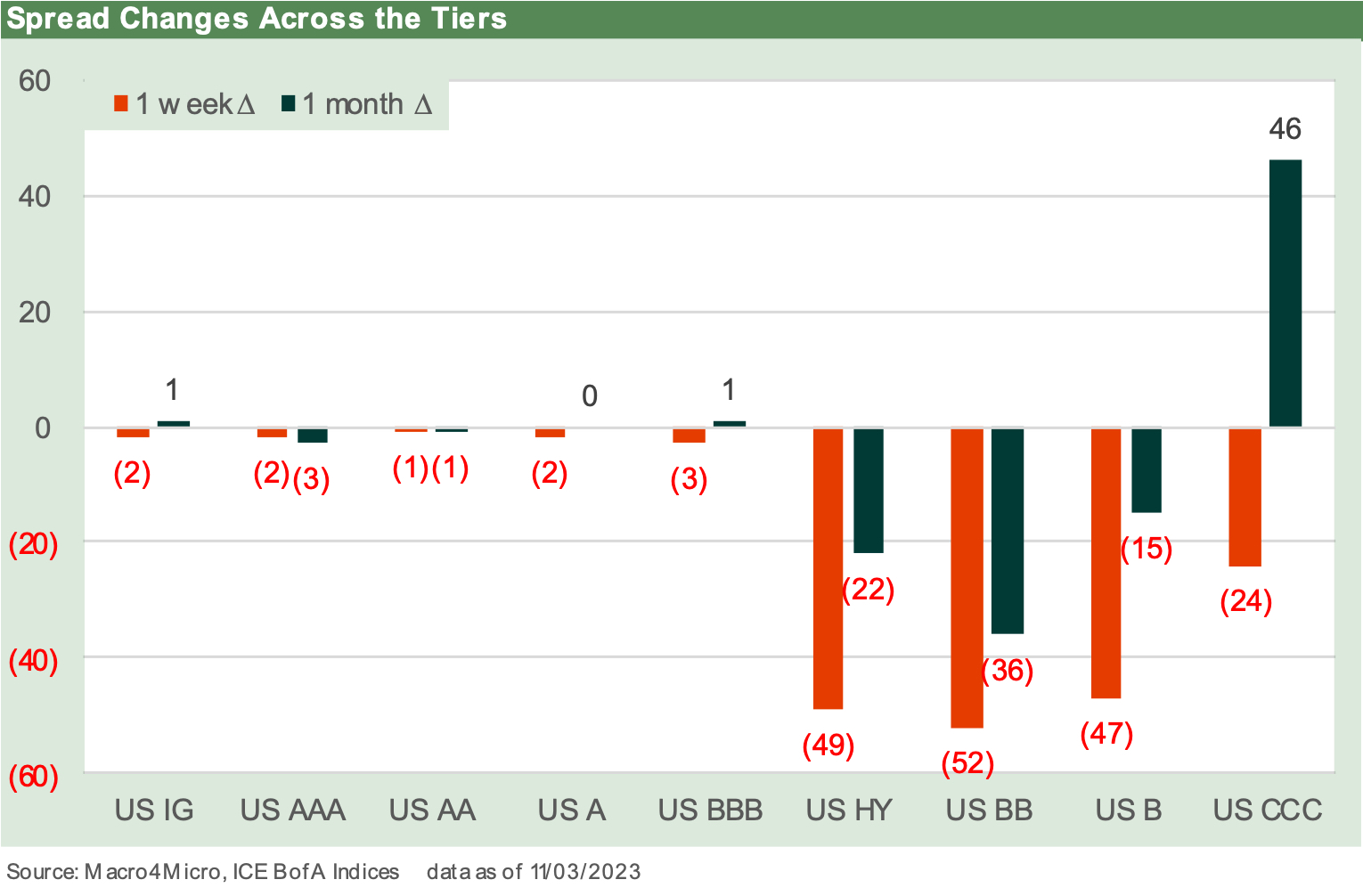 In this next section, we break down quality spreads starting with the asset class move from IG to HY. Then we go ratings tier by ratings tier.